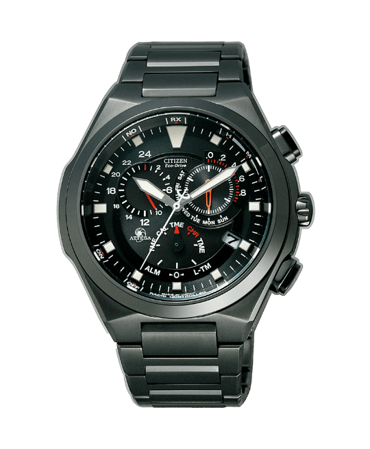 GPS衛星から受信した時刻を従来の2倍の運針速度で素早く表示する新ムーブメントCal.F950を搭載したCC4004-58Eは、チタニウム外装にシチズン独自の表面硬化技術「デュラテクトMRK」と「デュラテクトDLC」を重ねて施したモデルで、耐傷性と美しい艶を持つ「ブラックチタン™シリーズ」の最高峰に。