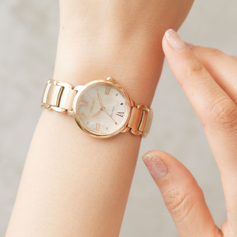 文字板は、シチズンの1960年代の時計からインスピレーションを得たデザイン。インデックスの上面には明るいブルーの差し色をあしらい、ドットのインデックスと相まって全体的に女性らしい印象に。