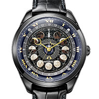 - デュラテクトDLCを施したケースやワニ革バンドのブラックと月齢盤のウォームグレーに、見返しリングのロイヤルブルーと針やインデックスのゴールドカラーがシックなアクセントになった限定モデルならではのカラーリング