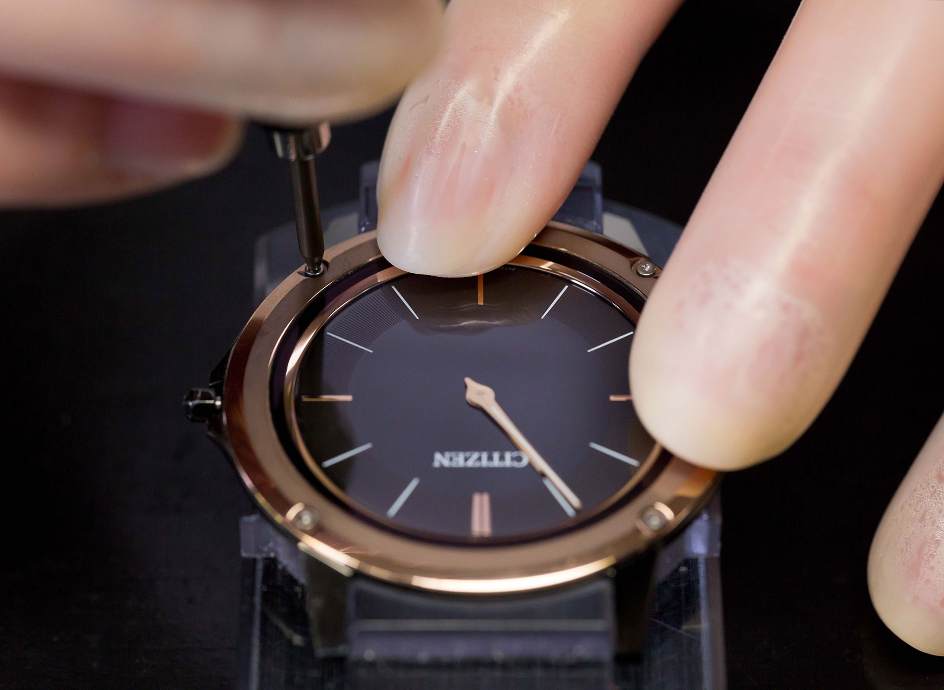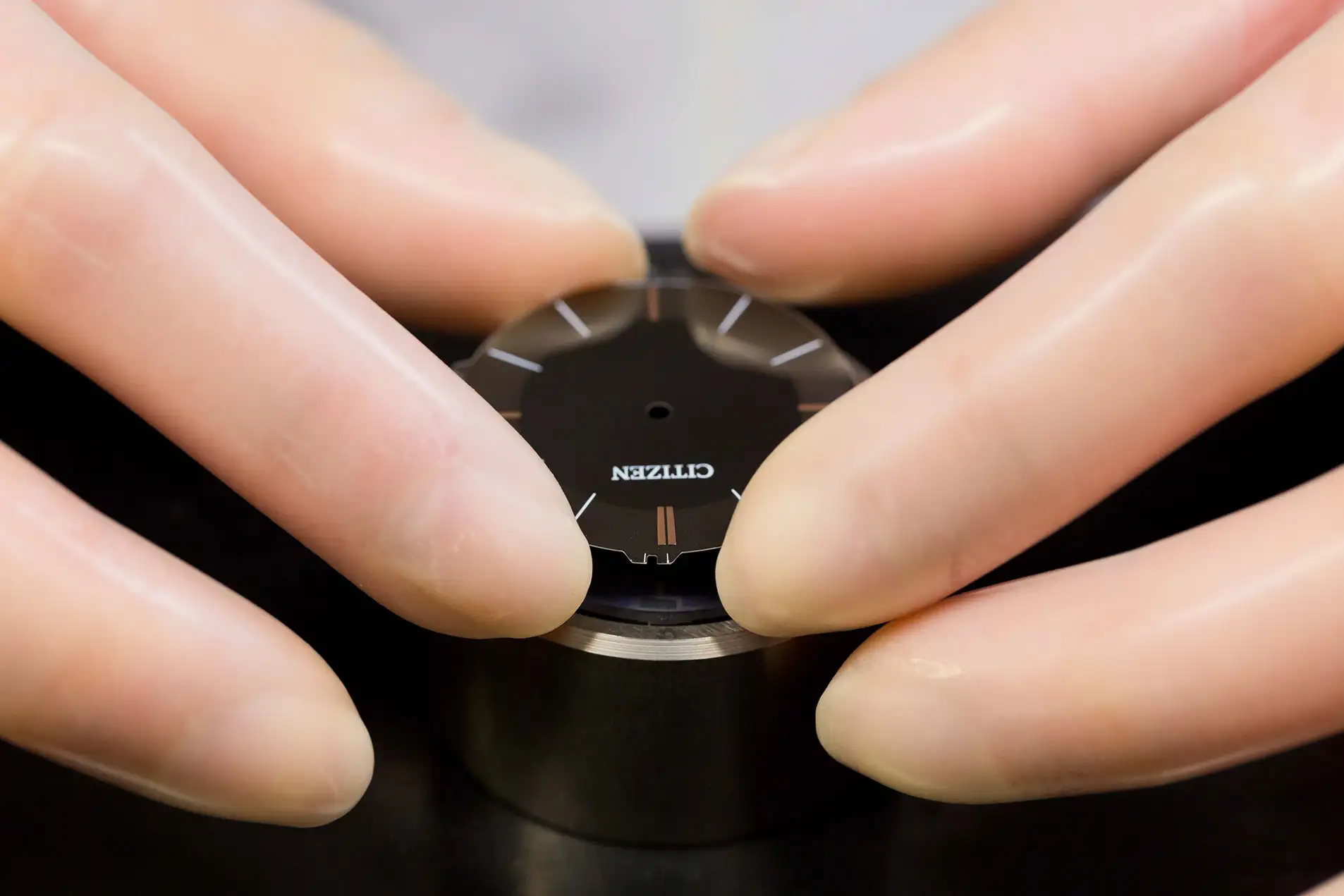 文字板には、強度と繊細な美しさを兼ね備えた「サファイアガラス」を採用。通常は厚さを確保して使うのが一般的ですが、シチズンの豊富な加工ノウハウをもとに、サファイアを薄くして使うというユニークな発想で課題にアプローチし、わずか150ミクロン(0.15mm)の薄さを実現*。ムーブメントに直接組み込むことも可能となり、さらなる薄さの実現に貢献しています。