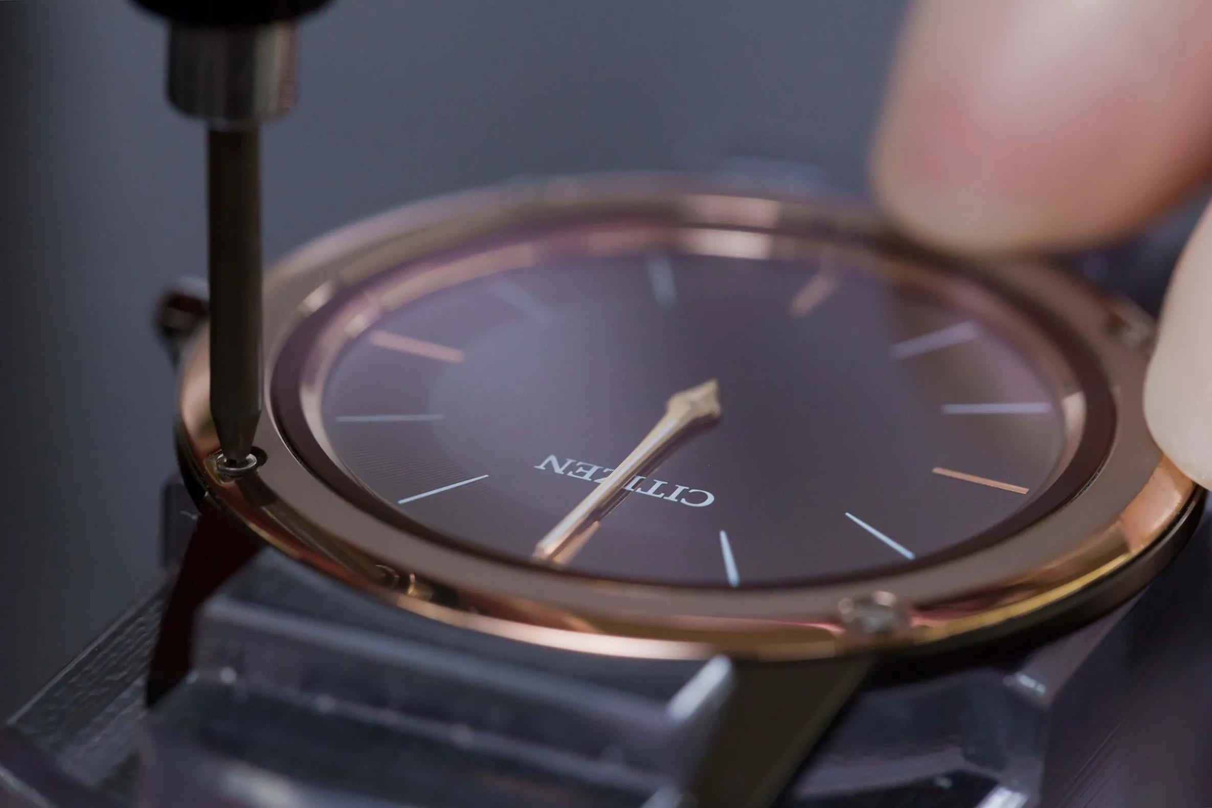ムーブメントのみならず、ケースデザインも薄さの追求へ。部品の厚さと隙間を極薄設計するにあたり、避けて通れない最大の課題が、「薄さ」と「強さ」の両立でした。Eco-Drive Oneでは、文字板やケース、ベゼルに使用する曲がりにくく、強度のあるさまざまな素材に着目し、積極的に採用しています。