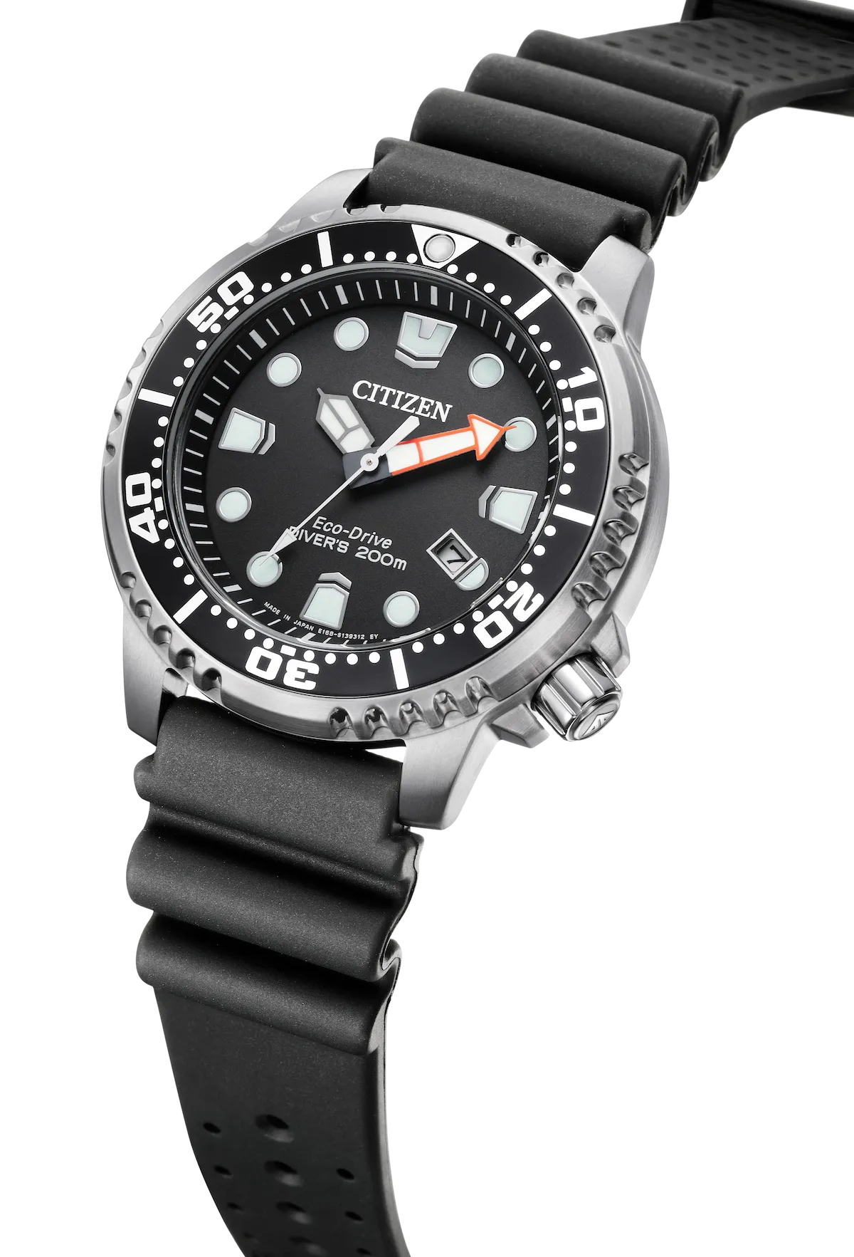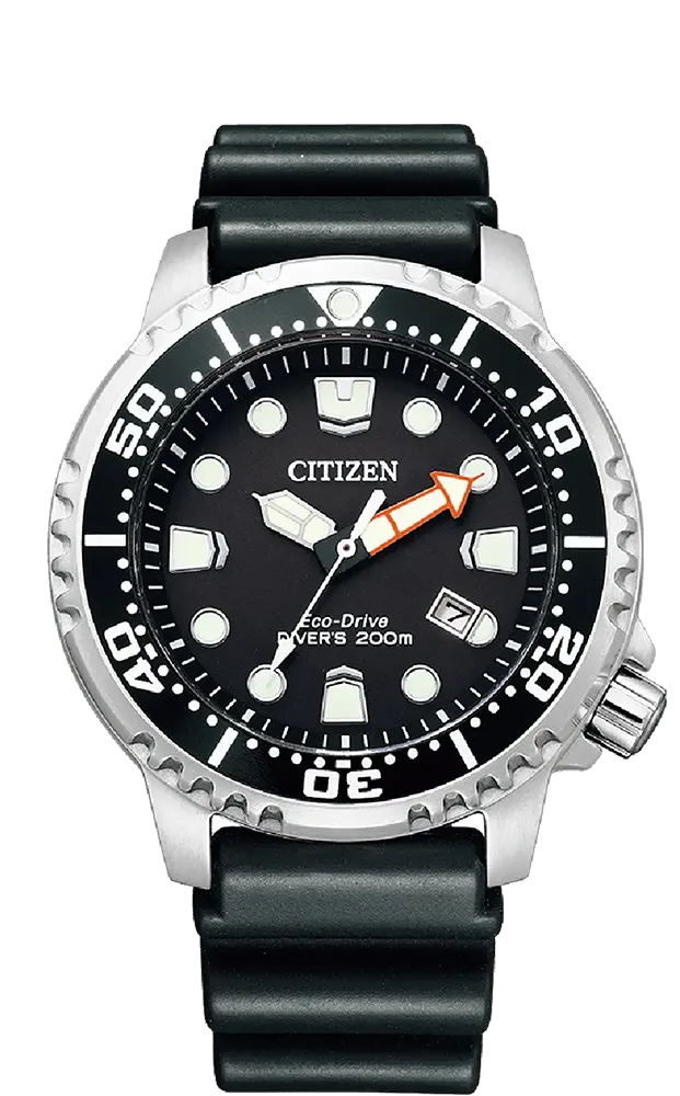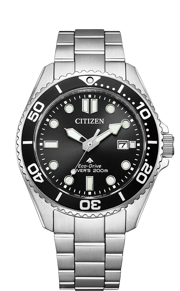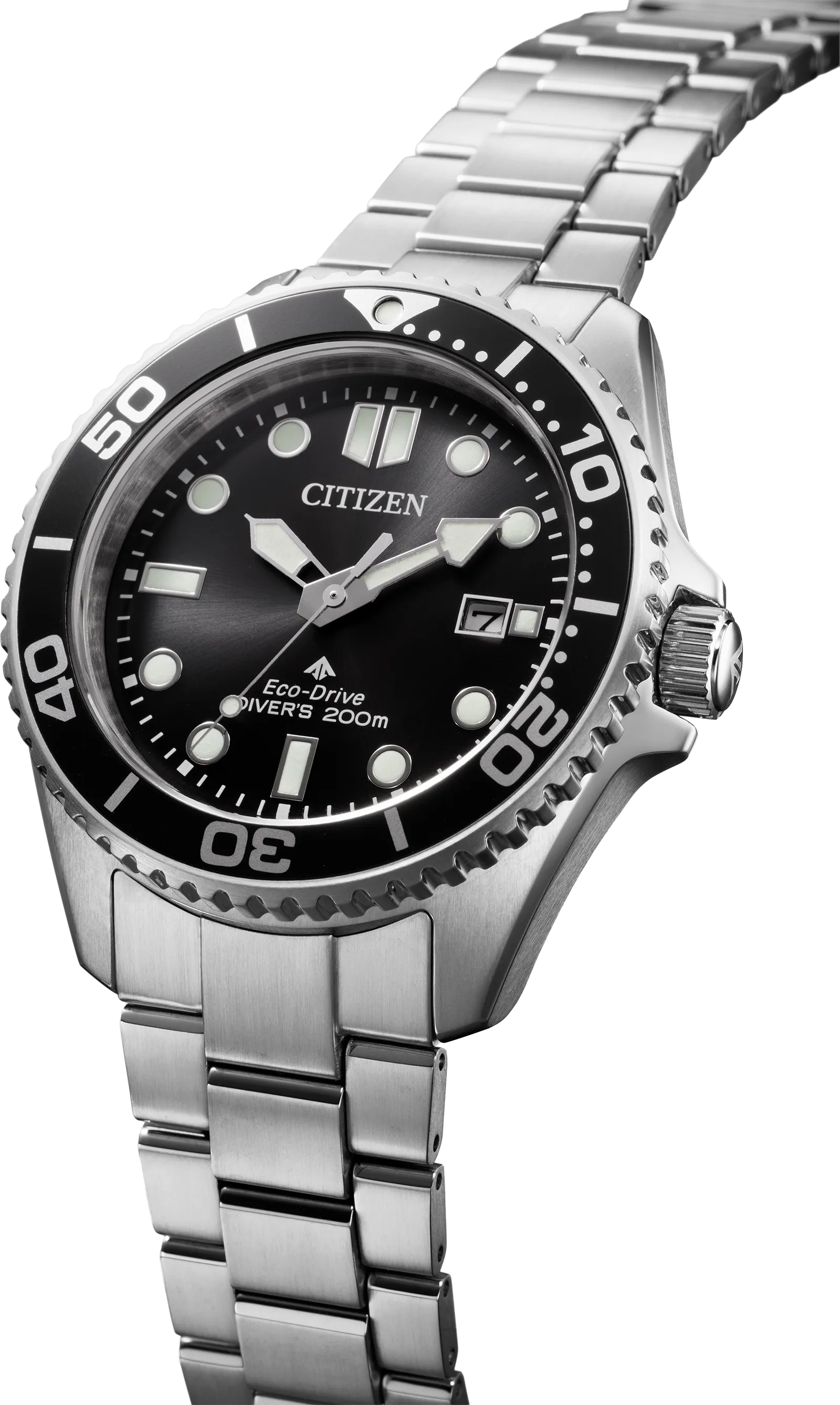 腕元になじみやすいケース径40.6mmのケースを採用した、正統派デザインのダイバーズウオッチ。3連メタルバンドは、別体構造の中駒を用い、斜面をミラー仕上げにした立体感のある力強いデザイン。ダイビングスーツを着用した際なども簡単に調整・装着できるラチェット付ダブルホールディングバックルを採用。