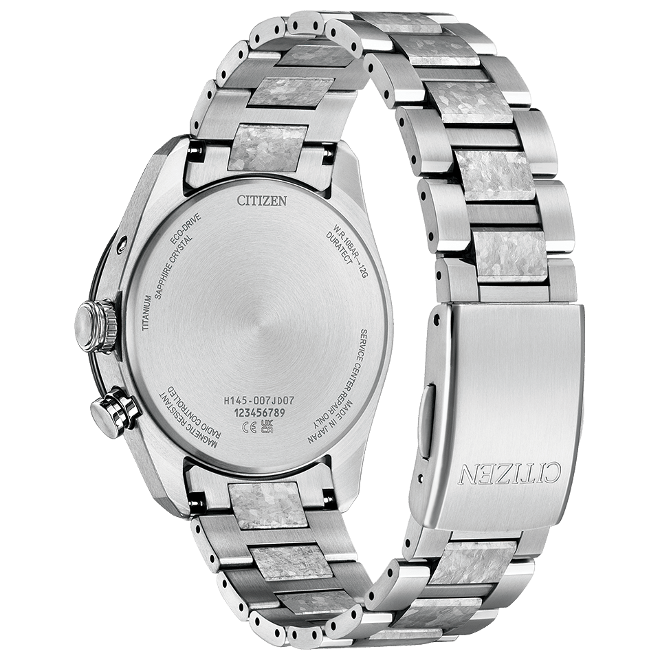 シチズン独自の技術で開発した結晶チタニウムを中駒に採用。デュラテクトプラチナを重ねることで結晶模様がプラチナの輝きをまとい、存在感を放ちます。