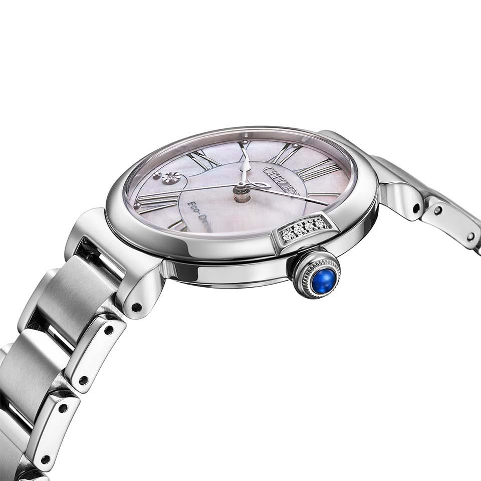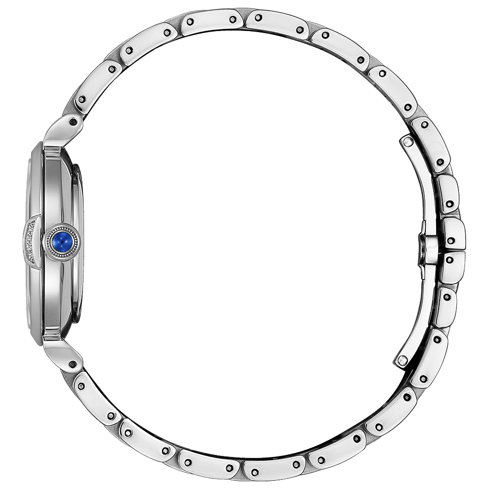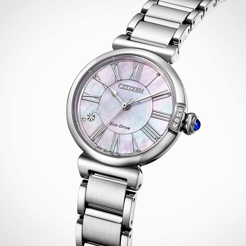 繊細なデザインのインデックスにも雫を思わせるパーツをあしらい、ジュエリーのさりげない輝きをプラス。3時の位置に並んだ4ポイントのダイヤモンドが、爽やかな印象を際立たせます。