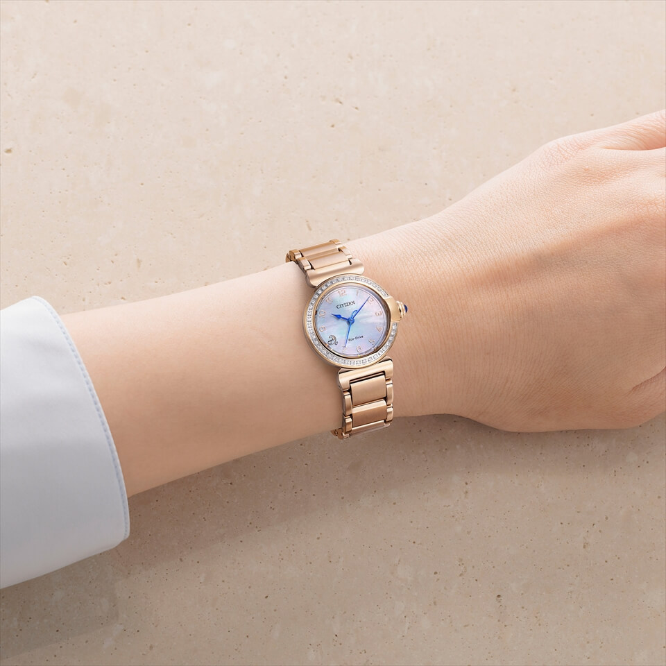スズランがモチーフで人気のあるROUND Collectionからミニサイズモデルが登場。ベゼルに直径1.1mmの天然ダイヤモンドを39個敷き詰めた存在感のあるケースが、手元をひときわ華やかに彩るジュエリーライクなデザインです。インデックスには、スズランのピュアな印象を表現したアラビア数字のフォントを採用。8時の位置に、スズランのしなやかな葉をつたう雫の輝きをあしらい、フェミニンな優しさと自然の躍動感を表現しました。
