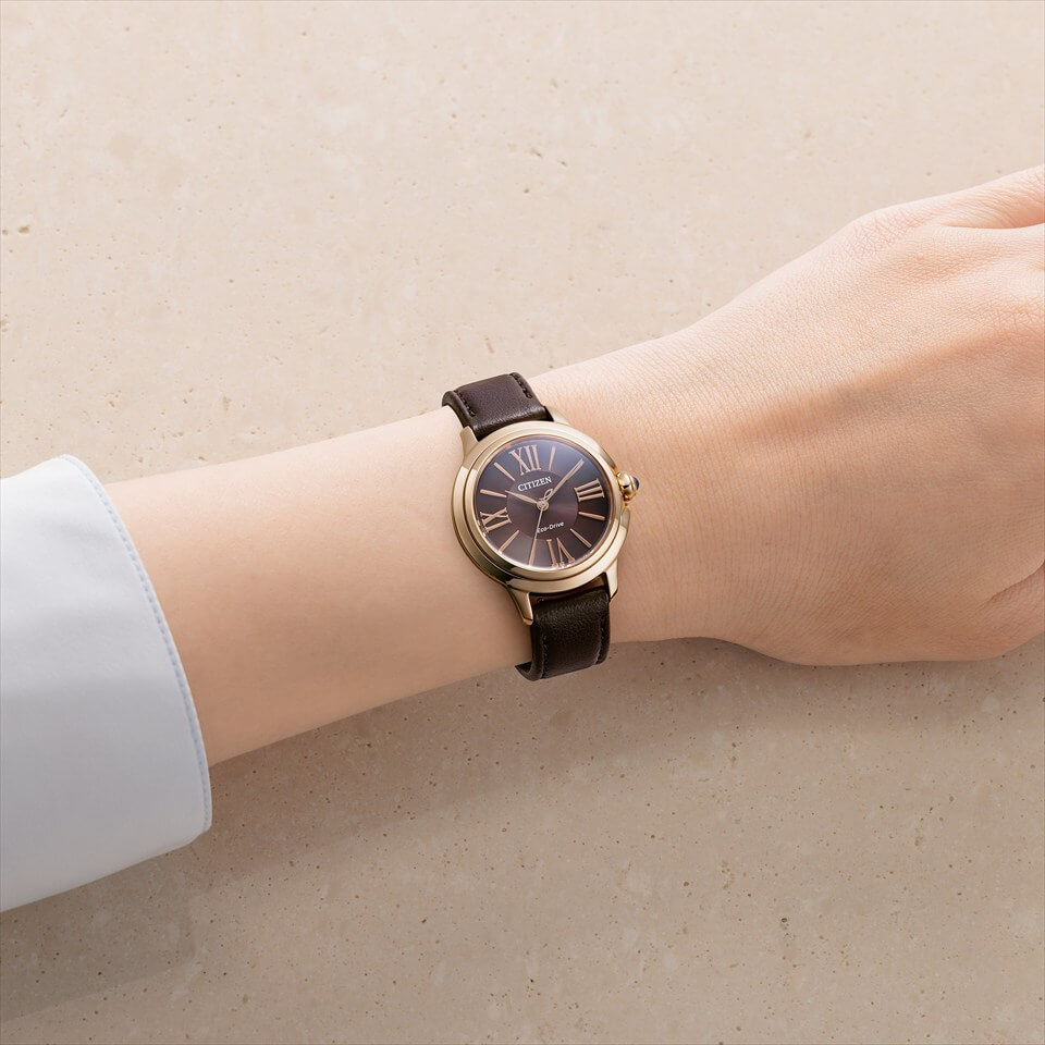 「つぼみを包む」をコンセプトに、内に秘める静かで強い植物の生命力を、柔らかな曲線とボリューム感で表現。重厚感も感じられる丸みを帯びたゆるやかなケースと、力強くスタイリッシュな印象の中に柔らかな印象のバンドに仕上げています。ゆったりとしたデザインのローマ数字インデックスと長いリーフ針、同じ色でまとめた文字板とバンドで、上品さと高級感を演出しました。