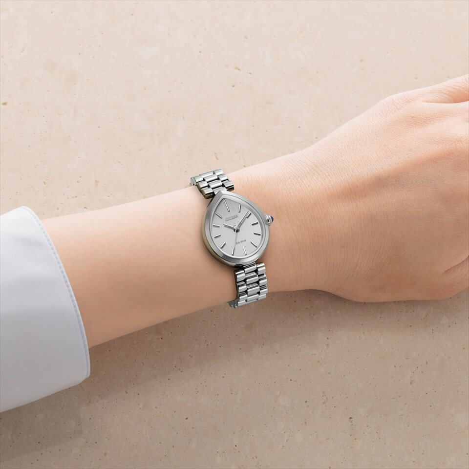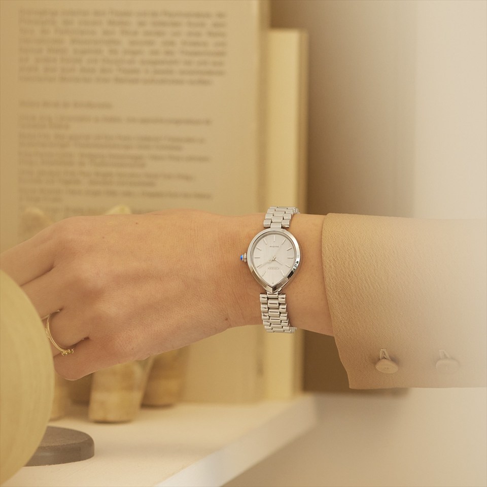 「Rain(雨)」と「Bella(美しい)」を組み合わせて名付けられた“RAINELL”(レイネル)。地球を潤し、世界を映しながら光を反射する雨の雫にインスピレーションを得たジュエリーライクなコレクションです。優雅な曲線を持つドロップ形状を印象付けるかのように、腕の動きでリズミカルな輝きを演出するボリュームある3列バンドを採用。彫刻的なフォルムは、立体感と陰影が美しく際立ち、どの角度から見ても洗練された存在感を放ちます。文字板には、霧雨を思わせるヘアラインパターンを施し、クラシカルで落ち着いたバランスのインデックスを配置、上品な印象に仕上げました。