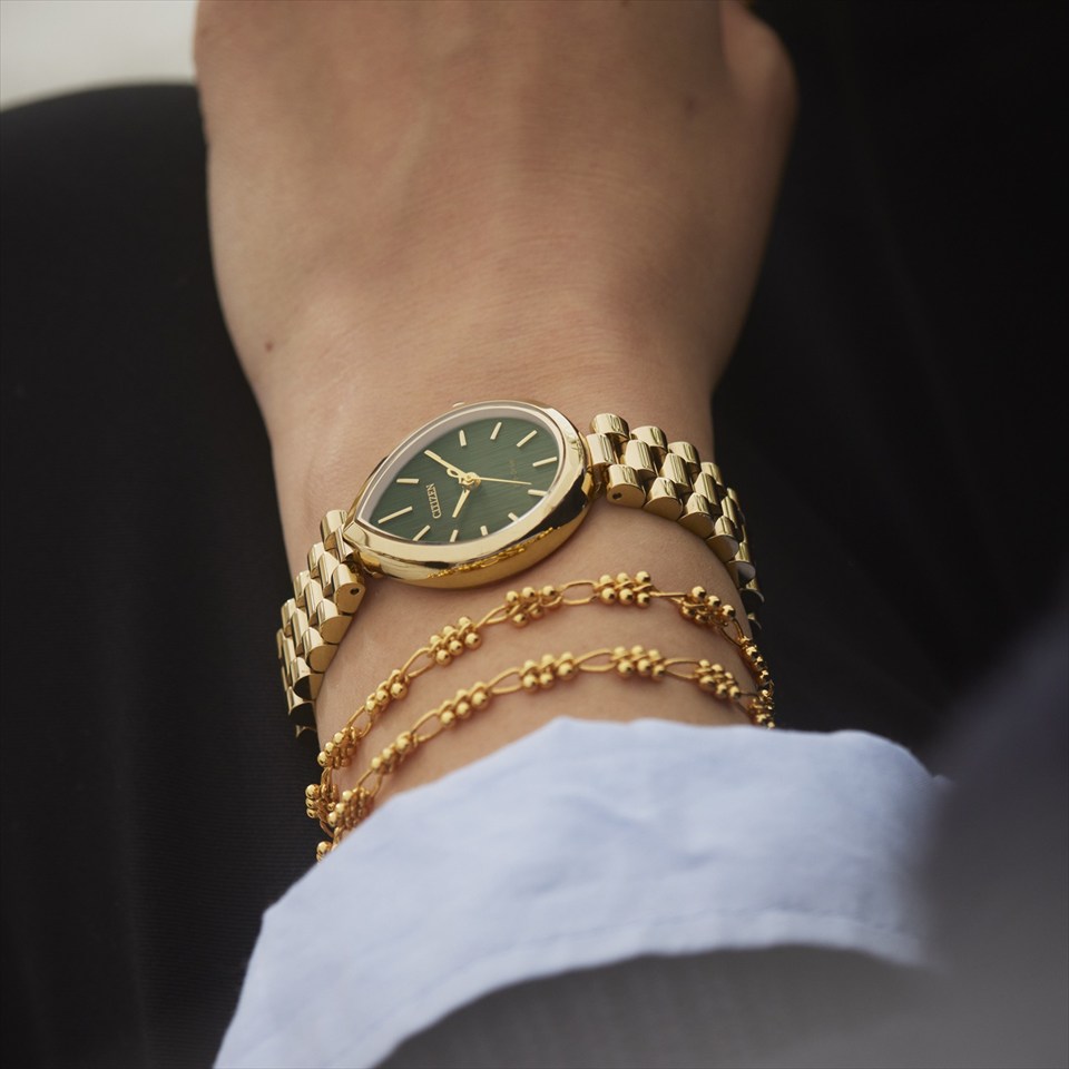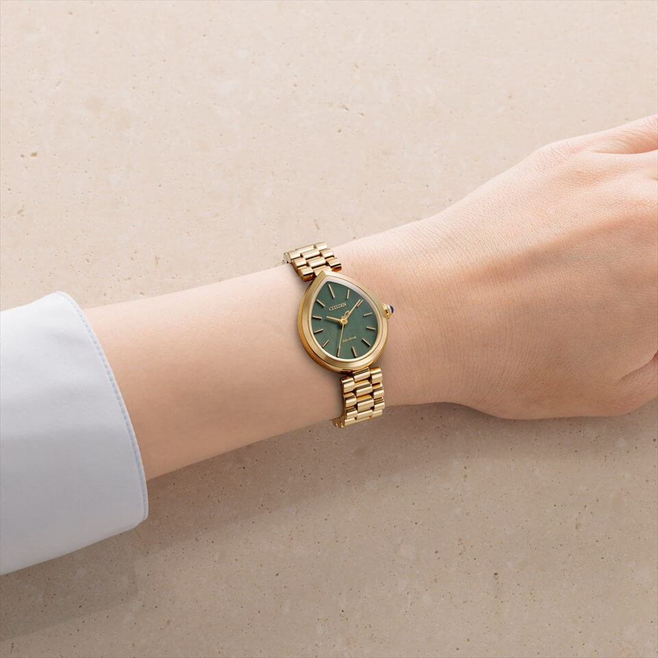 「Rain(雨)」と「Bella(美しい)」を組み合わせて名付けられた“RAINELL”(レイネル)。地球を潤し、世界を映しながら光を反射する雨の雫にインスピレーションを得たジュエリーライクなコレクションです。優雅な曲線を持つドロップ形状を印象付けるかのように、腕の動きでリズミカルな輝きを演出するボリュームある3列バンドを採用。彫刻的なフォルムは、立体感と陰影が美しく際立ち、どの角度から見ても洗練された存在感を放ちます。文字板には、霧雨を思わせるヘアラインパターンを施し、クラシカルで落ち着いたバランスのインデックスを配置、上品な印象に仕上げました。