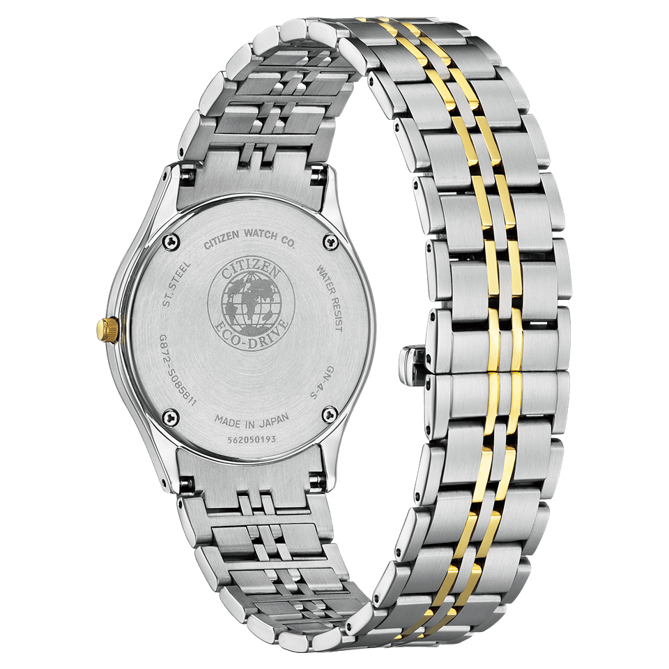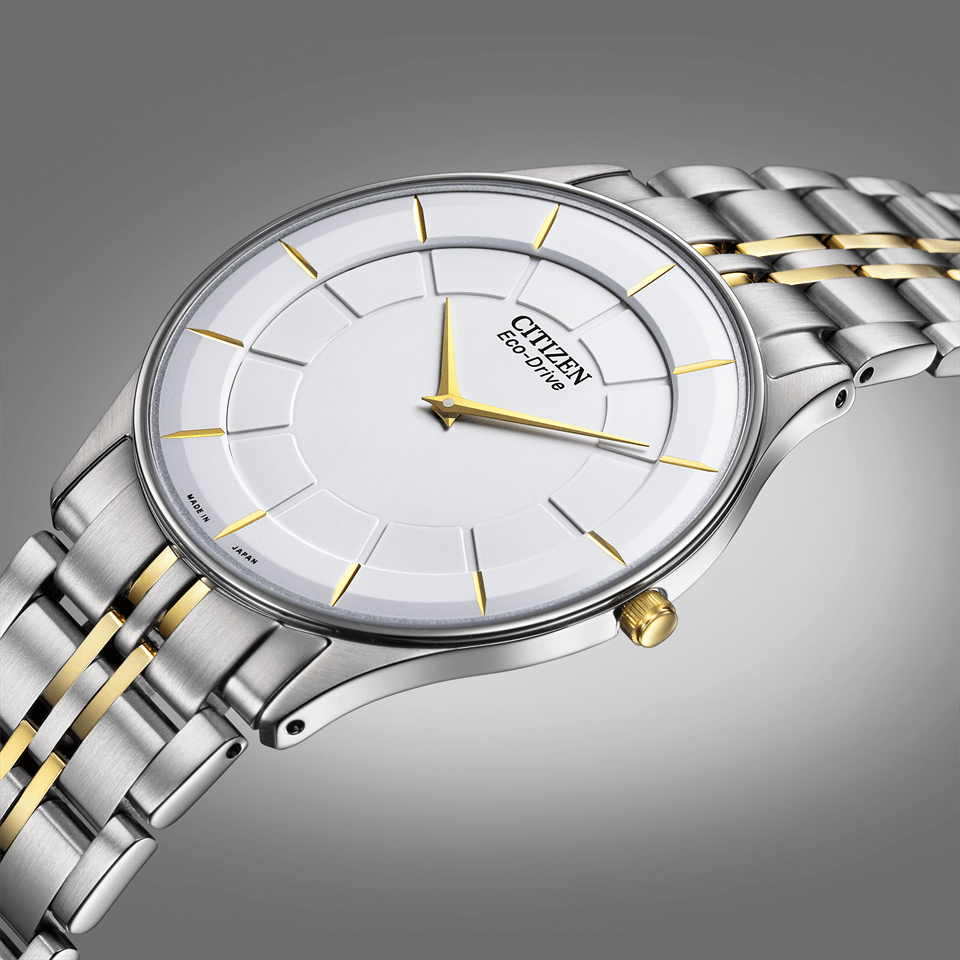 光発電『エコ・ドライブ』は、太陽光や室内のわずかな光を電気に換え、時計を動かしつづけるシチズン独自の技術です。一度フル充電すれば、光のないところでも長時間動き続けるので、定期的な電池交換は必要ありません。