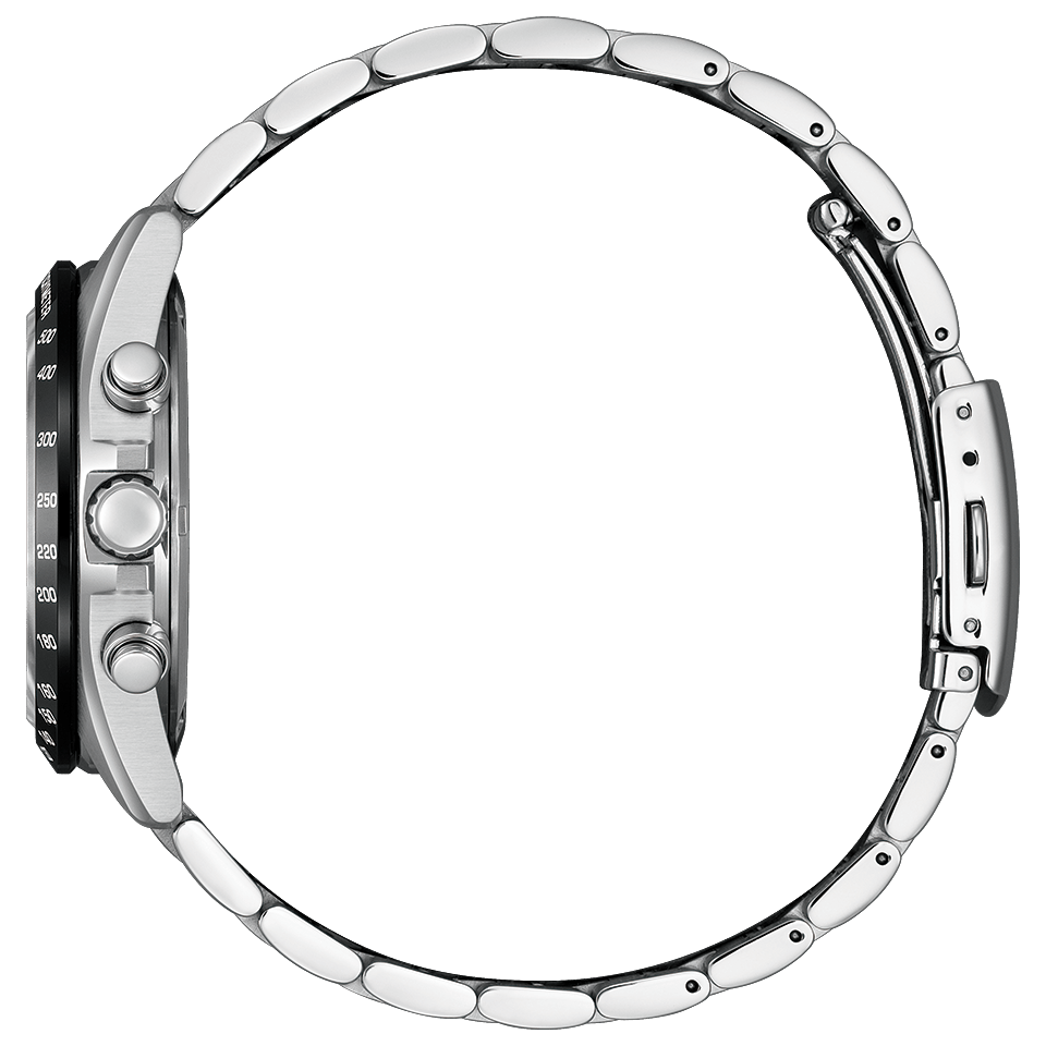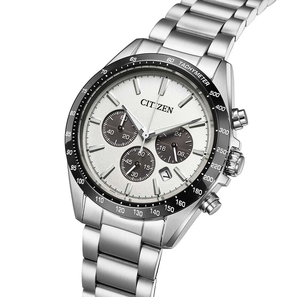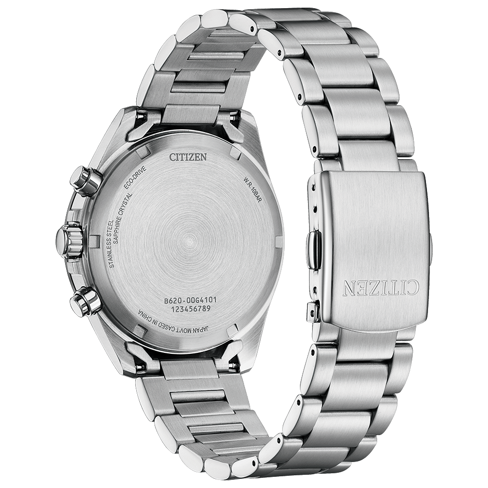スポーティで洗練されたルックスのスタンダードなエコ・ドライブ クロノグラフモデル。ラグを太く短く、ベゼルをワイドに設計し、タキメーターの数値表記を横書きにすることで、スポーティさを引き立てました。光沢のある発色の良い金属文字板を採用。デザインのアクセントでもある3つのサブダイヤル部分が光を取り込み、電気エネルギーへと変換する仕様です。暗い場所でも時刻を読み取りやすい夜光付きの時分針とインデックスや、視認性を高めるために広めに設けられた日付表示の開口部など、快適な使用感を追求しました。