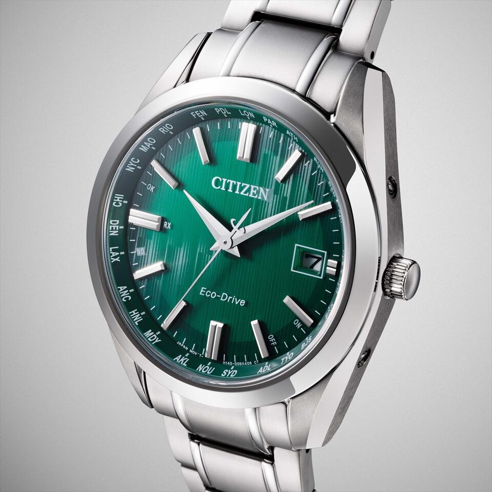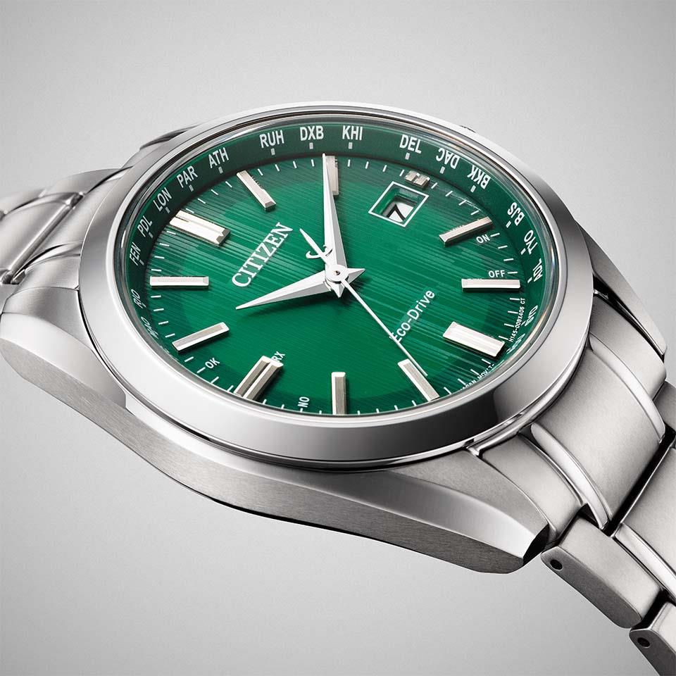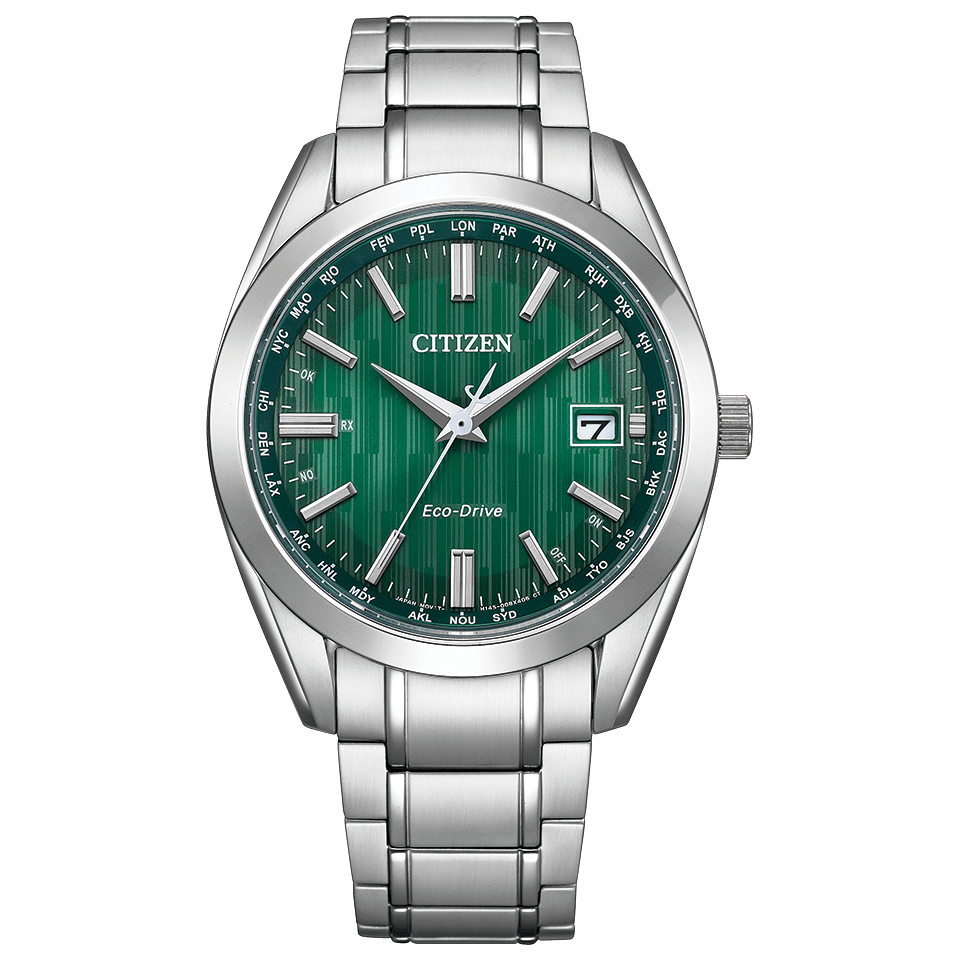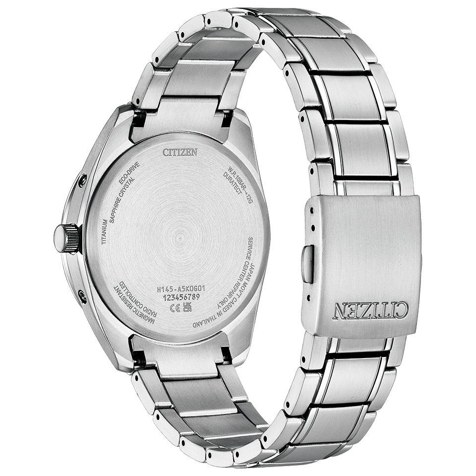 ケースとバンドにスーパーチタニウム™を採用した、ベーシックな3針タイプのエコ・ドライブ電波時計。ベゼルとバンドにはミラー面も取り入れ、上質感を演出しました。落ち着いたカラーで縦方向にパターンをあしらった文字板は、シンプルで見やすく、幅広いシーンでお使いいただけるデザインです。