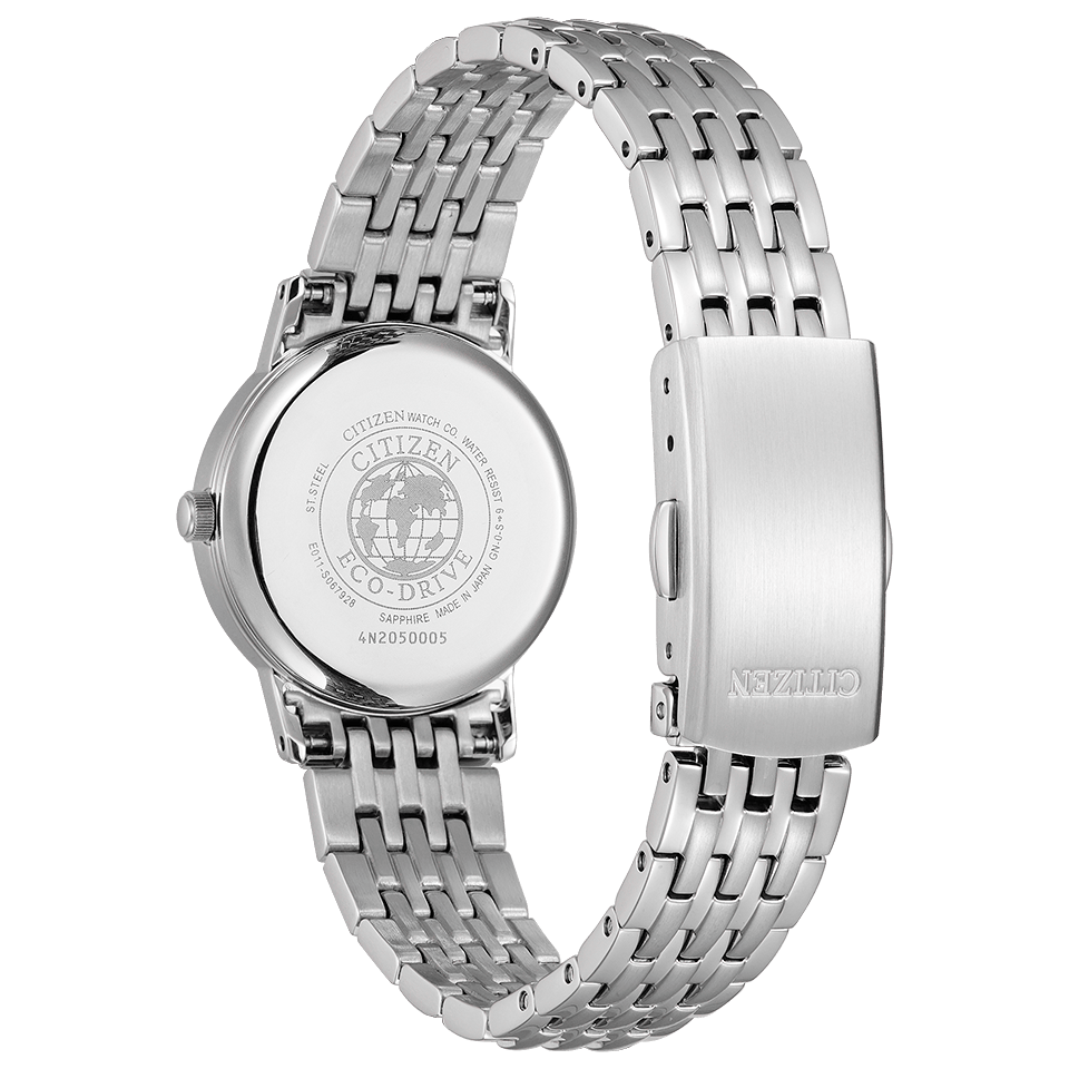 光発電『エコ・ドライブ』は、太陽光や室内のわずかな光を電気に換え、時計を動かしつづけるシチズン独自の技術です。一度フル充電すれば、光のないところでも長時間動き続けるので、定期的な電池交換は必要ありません。