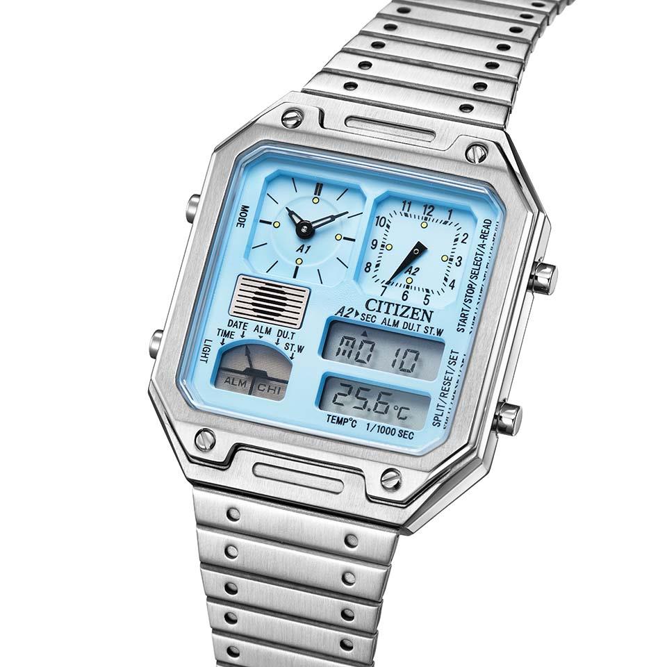 レトロフューチャーなデザインが人気のレコードレーベルから限定ウオッチが登場。レトロな外装と1990年代のプロダクトを思わせる個性的なカラーで、遊び心と懐かしさが同居するデザインです。文字板に夜光塗料を施し、その上にポップなカラーを重ねた特別仕様。光を蓄えると暗闇でも文字板全体がぼんやりと浮かび上がり、視線をキャッチします。