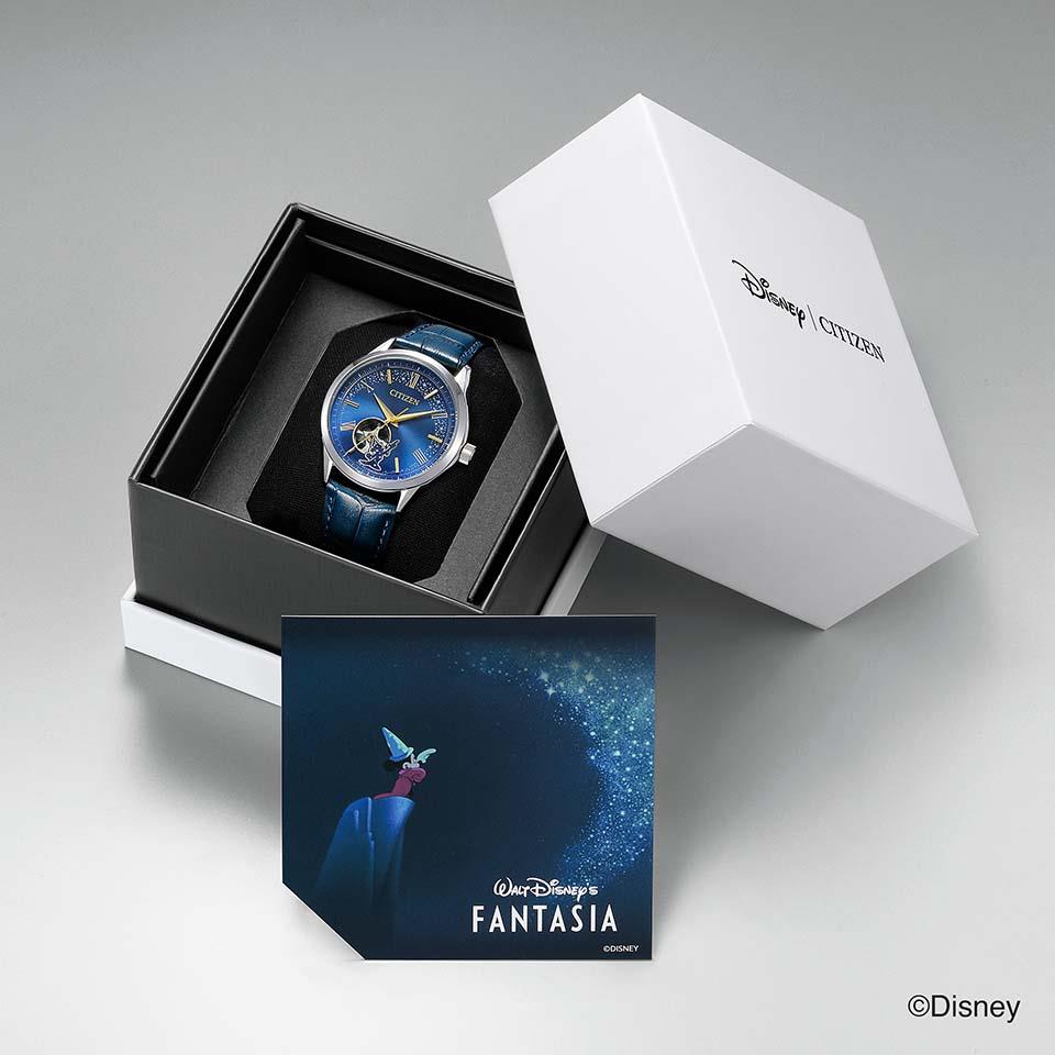 『Disney FANTASIA』の世界観を表現した限定モデル。美しい夜空をイメージしたネイビーの文字板に、「ミッキー」のシルエットをオープンハートに重ねることで時計との一体感を演出。魔法使いの弟子に扮した「ミッキー」の帽子には、星と月のモチーフをさりげなく描いています。裏ぶたはシースルーバックを採用し、回転する錘(おもり)やメカの動きを楽しめます。