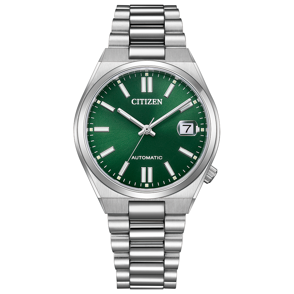 発色の良い文字板にシンプルでベーシックな針とインデックスを組み合わせ、すっきりとしたデザインが魅力の機械式時計です。スポーティなケース形状と腕なじみの良い3列バンドで付け心地の良さにもこだわり、カレンダー部分には視認性を高める拡大鏡レンズを採用しました。シースルーバックの裏ぶたで、機械式時計ならではの回転する錘(おもり)やメカの動きを楽しめます。