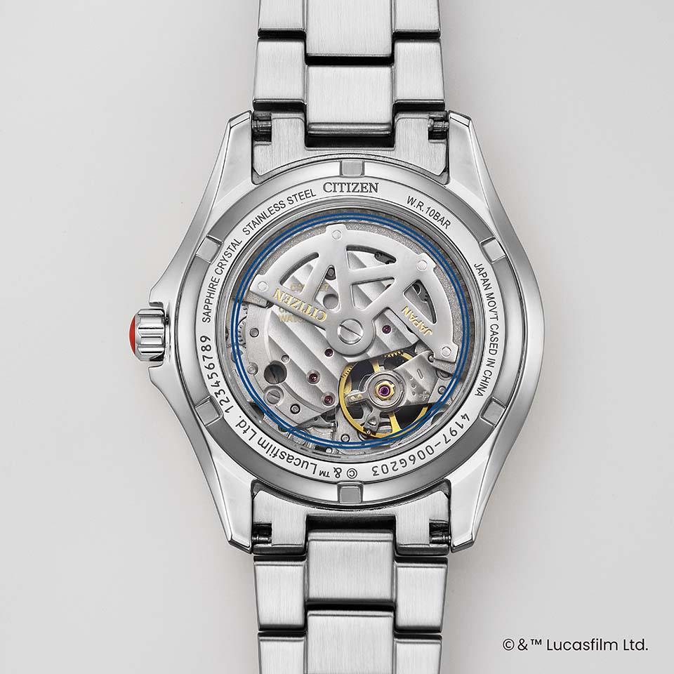 シルバーとブルーを基調にまとめ、文字板はボディのフラップ模様をエッチングで表現。赤いランプカラーをりゅうずのアクセントとしてあしらい、裏ぶたにはブルーのラインをあしらいました。