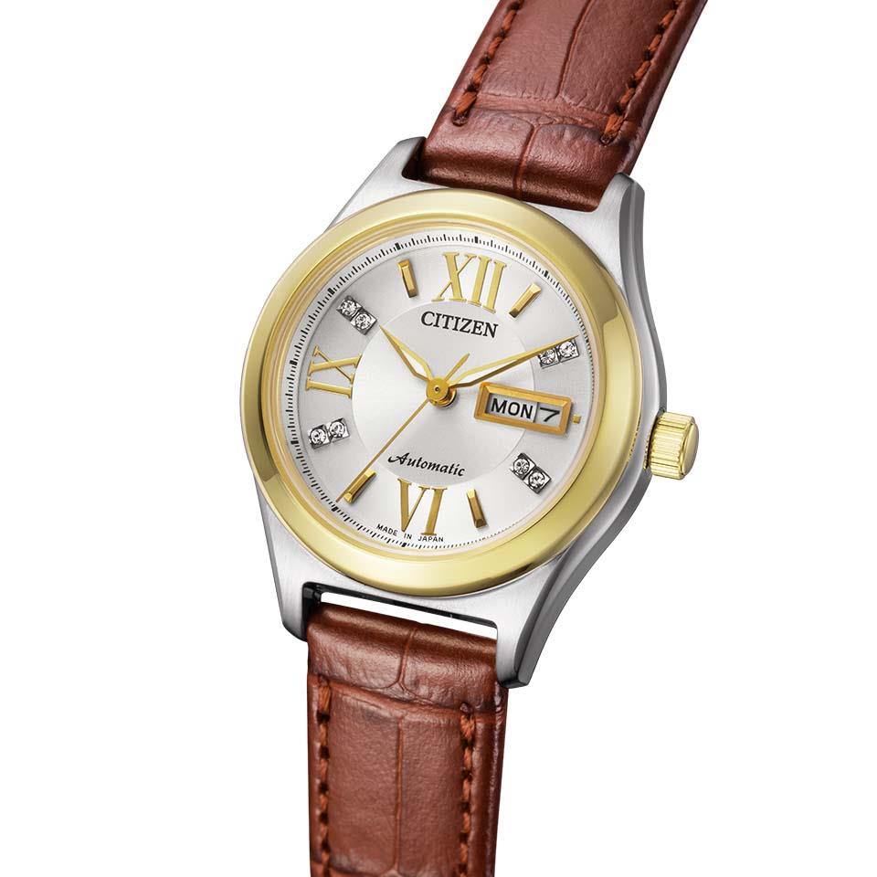 型押しを施した、赤ワインを思わせる落ち着いたレッドの牛革バンドに、イエローゴールドのベゼルが映えるデイ&デイト表示付きのメカニカルウオッチです。2、4、8、10時のインデックスに合計8つのクリスタルガラスをレイアウトした、華やかなデザイン。裏ぶたは、回転する錘(おもり)や繊細なメカの動きを楽しめるシースルーバック仕様です。