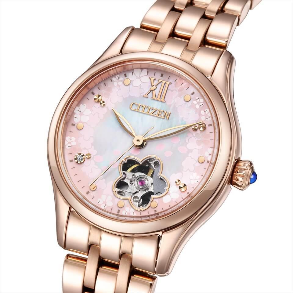 メカニカルウオッチならではの動きが楽しめるオープンハート仕様。桜の花の形に切り取られた開口部がアクセントになった特別感のあるデザインに仕上げました。