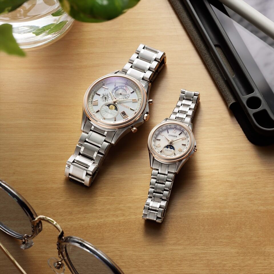3連リングベゼルが、月の周りに広がる光の輪「月暈(つきがさ)」をイメージにしたモデルです。この現象は「幸せの訪れを意味するもの」として幸運のサインであるという言い伝えがあります。サン&ムーン機能を搭載した レディスモデルとのペアウオッチにおすすめです。