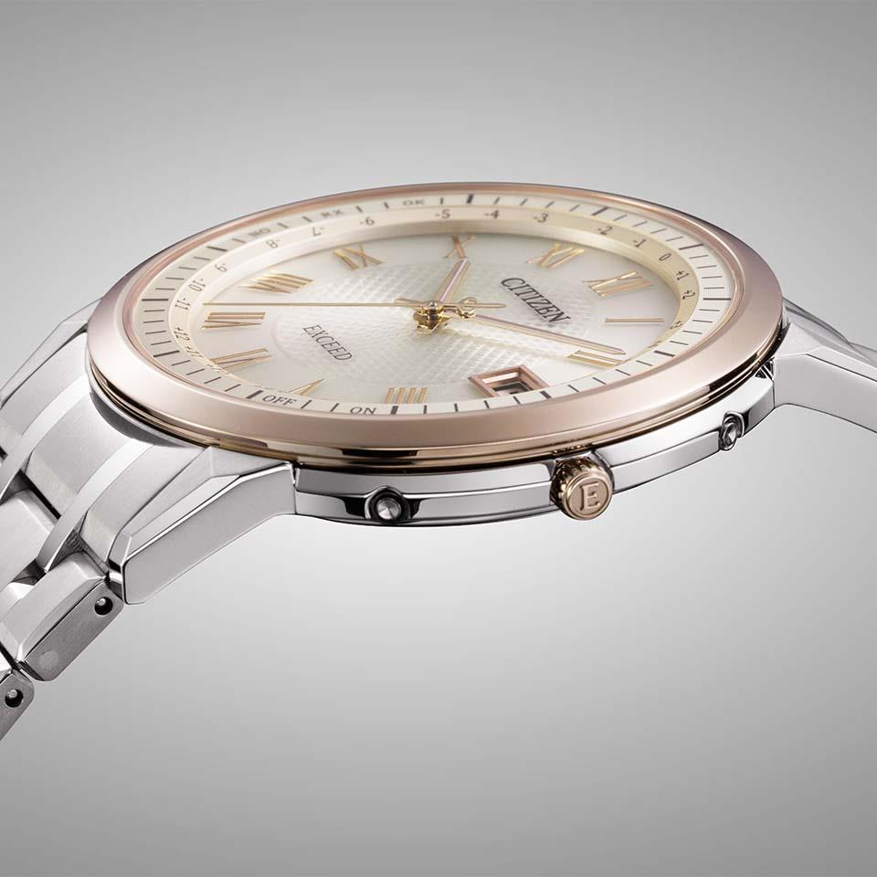 日中米欧4エリアで受信可能な多局受信型エコ・ドライブ電波時計としてケース総厚7.0mm(設計値)を実現。上品で柔らかな印象がきわだつベージュ色の文字板を採用。中央にあしらったピラミッドパターンがクラシカルな表情を演出します。透明感のあるライトシルバー色のケースとバンド、サクラ色のベゼルを合わせたツートーン仕様がエレガントな雰囲気を引き立てます。