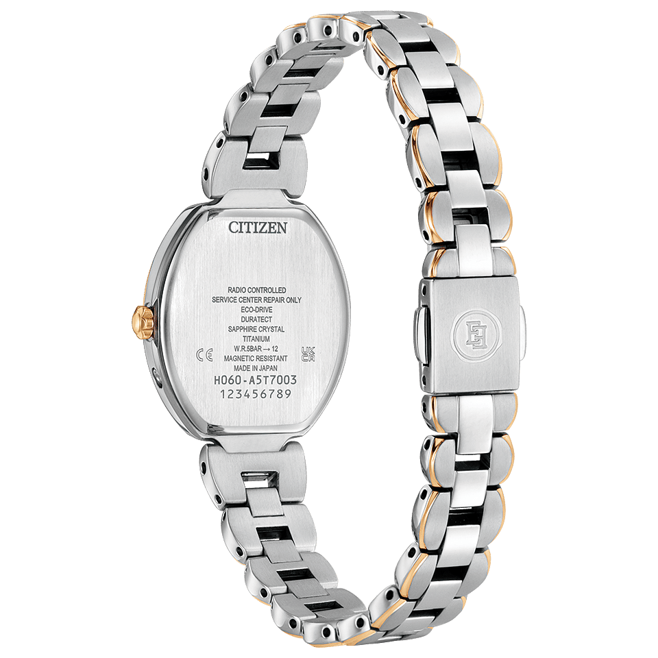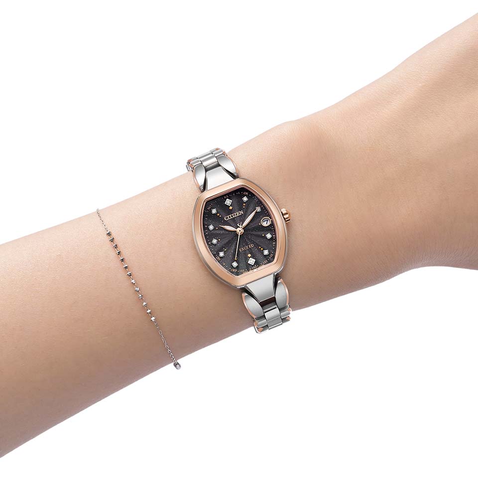 人気のあるお花をモチーフにしたバンドに、ピンクゴールドのベゼルを合わせたツートン仕様。柔らかく広がる光をデザインに込め、新しいときを感じる表情に仕上げました。文字板にはシルバーのラメを練り込み、中央から光が広がるような放射パターンを組み合わせ、華やかさと奥行きのある幻想的なデザインに。放射パターンに沿って、11ポイントのダイヤモンドをあしらった限定モデルです。