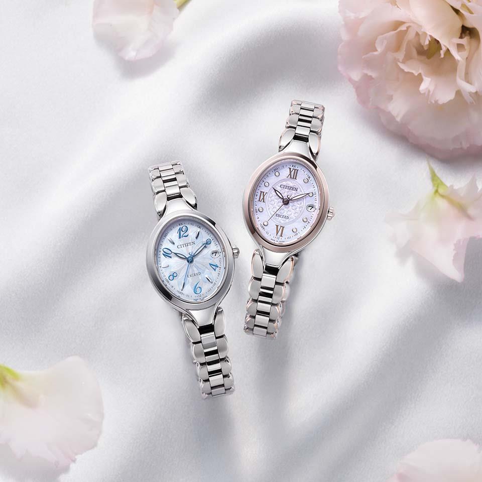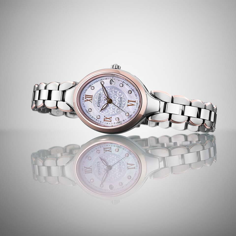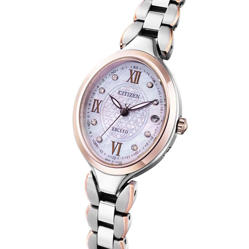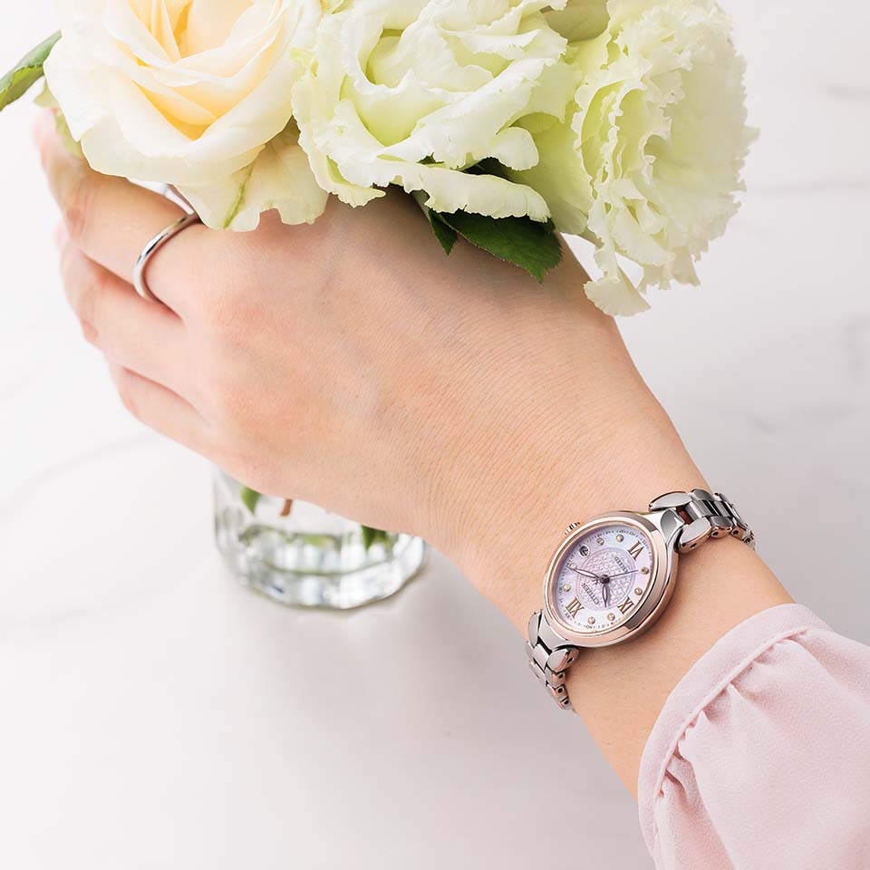 ブラウンのローマ数字インデックスと針を採用し、8ポイントのダイヤモンドをセッティング。ピンクの白蝶貝文字板に小花のパターンを彫刻で表現した、艶やかさと華やかさあふれるデザインです。