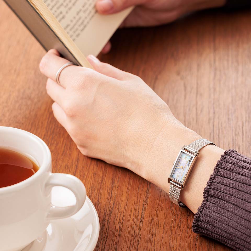 スリムな形状が人気のスクエアケースに、美しい白蝶貝文字板を合わせた限定モデル。文字板中央にギョーシェ彫りを思わせるパターンを施し、高級感と華やかさをきわだたせました。