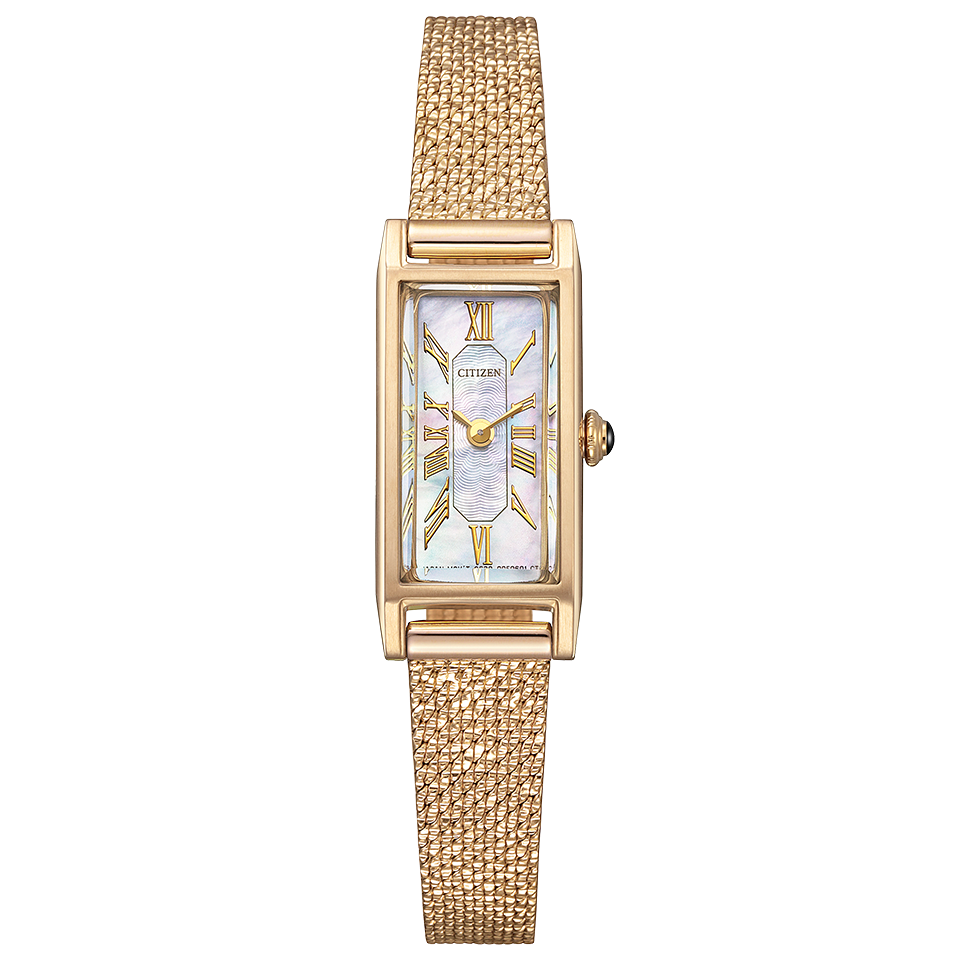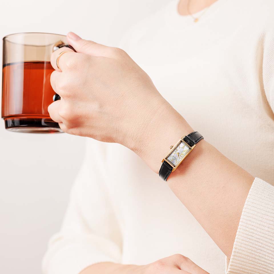 スリムな形状が人気のスクエアケースに、美しい白蝶貝文字板を合わせた限定モデル。文字板中央にギョーシェ彫りを思わせるパターンを施し、高級感と華やかさをきわだたせました。