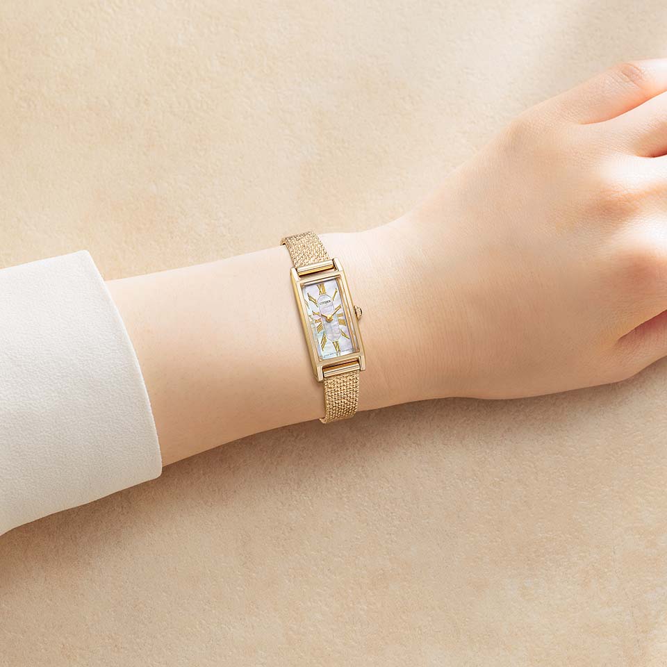 光発電『エコ・ドライブ』は、太陽光や室内のわずかな光を電気に換え、時計を動かしつづけるシチズン独自の技術です。一度フル充電すれば、光のないところでも長時間動き続けるので、定期的な電池交換は必要ありません。