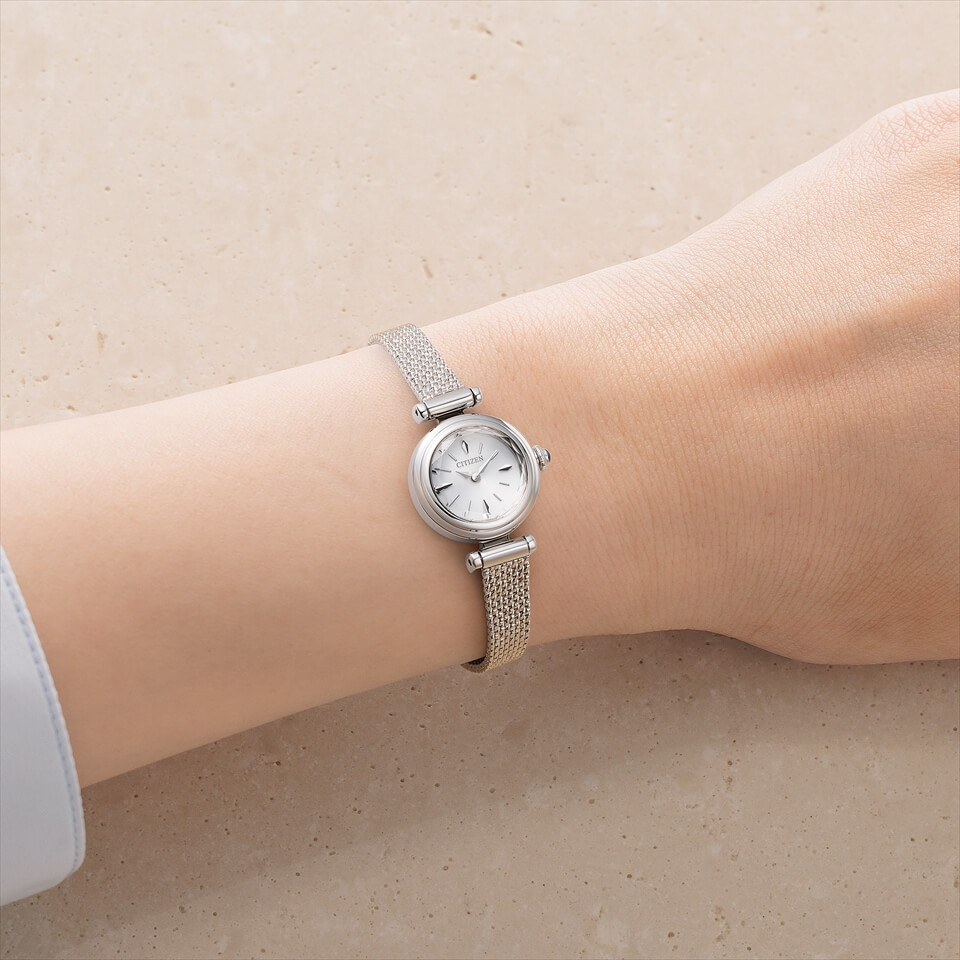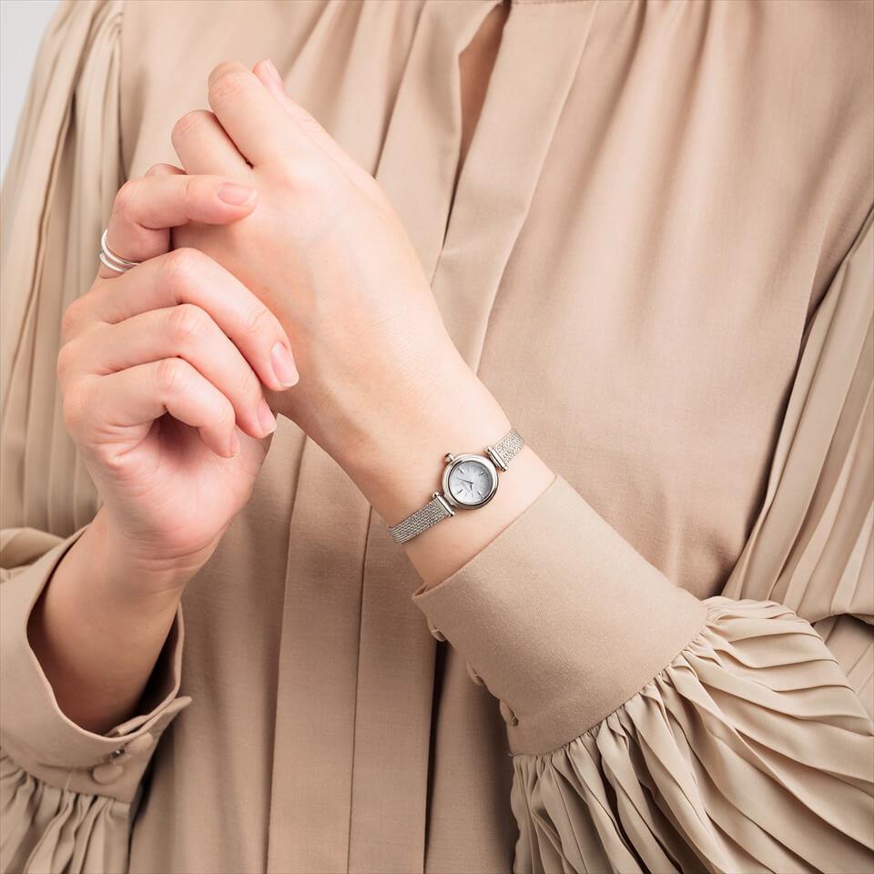 ころんとした形に、華奢な佇まいが魅力のラウンドケース。飾りピンに見立てたパーツやメッシュバンドが、シックでアンティークなジュエリーのような表情を演出。ガラス製のアクセサリーボックスをイメージしたカットガラスが繊細に輝きます。りゅうずにはケースに合わせたアクセントカラーをプラスし、さりげないおしゃれを楽しめます。