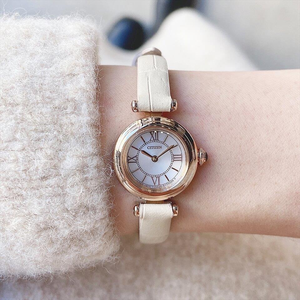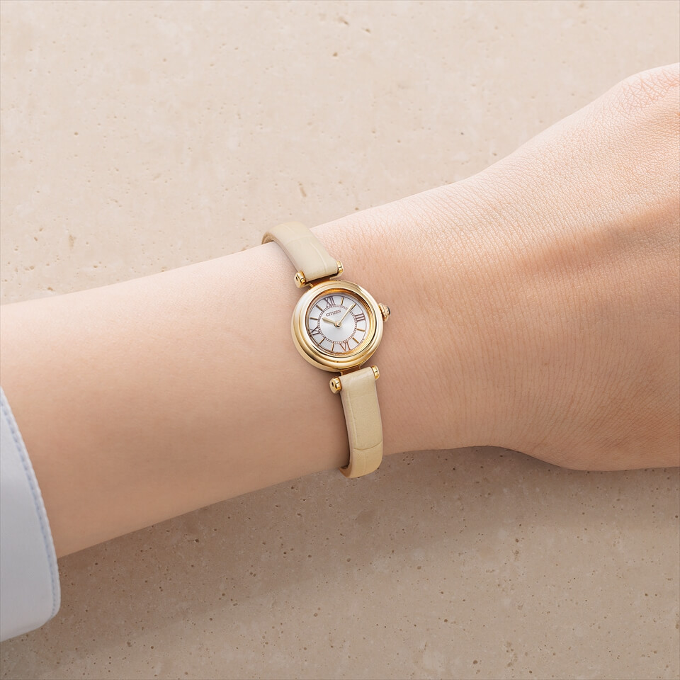 ころんとした形に、華奢な佇まいが魅力のラウンドケース。インデックスにはクラシカルでマニッシュな印象のローマ数字フォントを採用し、小さめサイズながらも視認性に優れています。風合いのある牛革バンドは、裏地のカラーリングにもこだわり、細部のおしゃれまで楽しめる1本です。