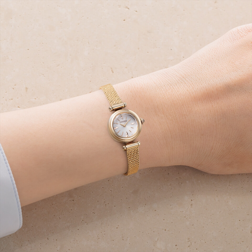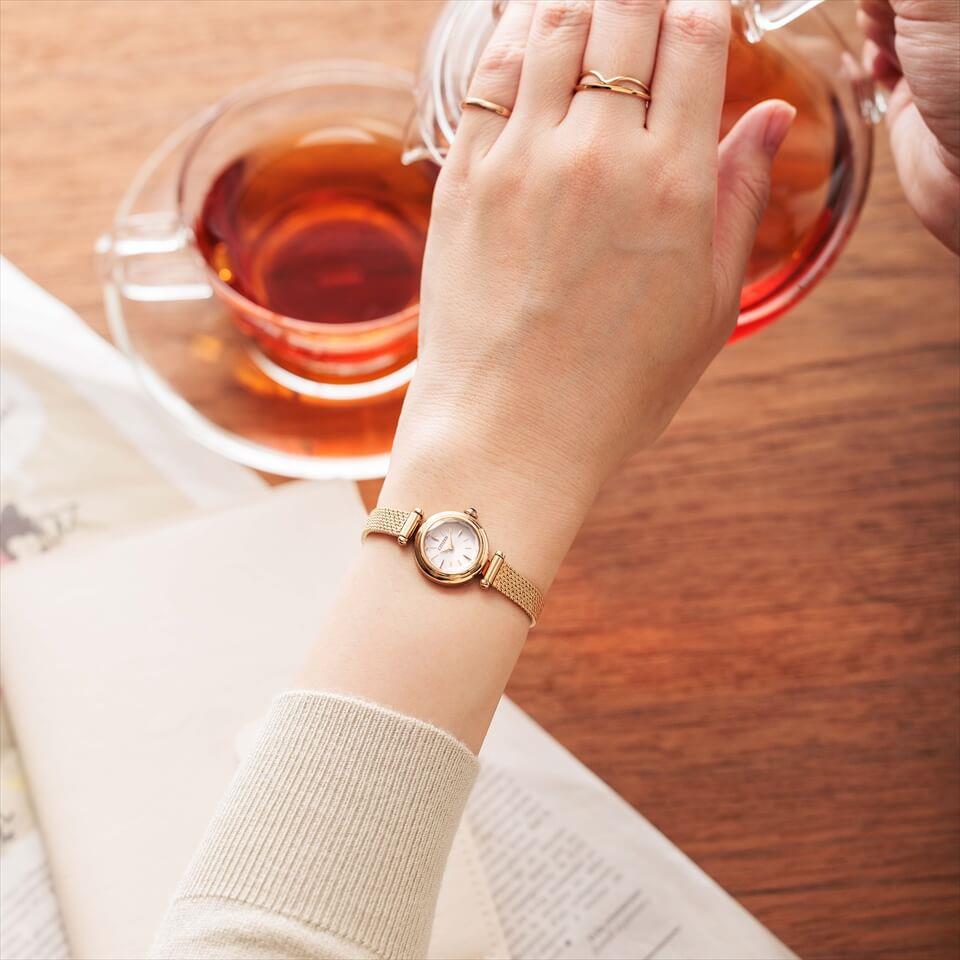 ころんとした形に、華奢な佇まいが魅力のラウンドケース。飾りピンに見立てたパーツやメッシュバンドが、シックでアンティークなジュエリーのような表情を演出。ガラス製のアクセサリーボックスをイメージしたカットガラスが繊細に輝きます。りゅうずにはケースに合わせたアクセントカラーをプラスし、さりげないおしゃれを楽しめます。