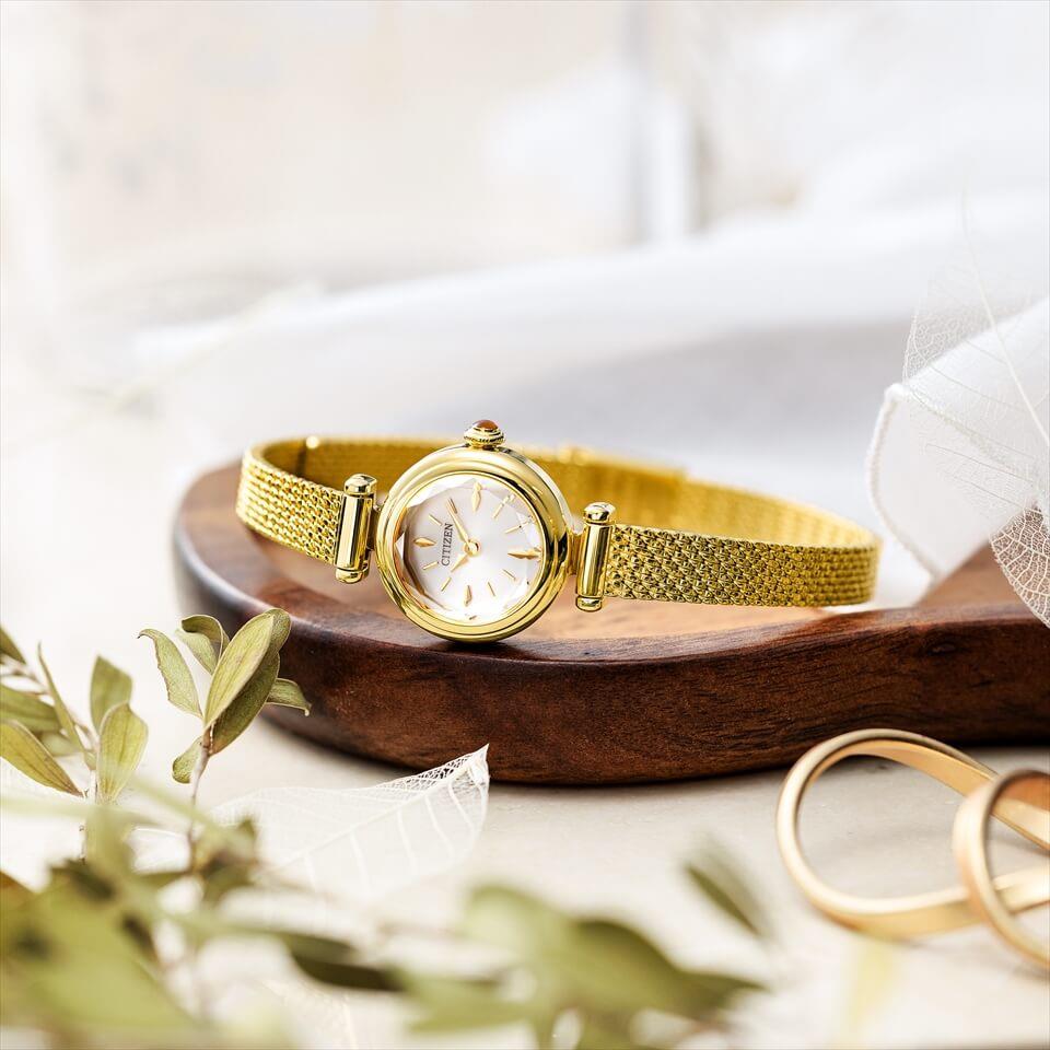 ころんとした形に、華奢な佇まいが魅力のラウンドケース。飾りピンに見立てたパーツやメッシュバンドが、シックでアンティークなジュエリーのような表情を演出。ガラス製のアクセサリーボックスをイメージしたカットガラスが繊細に輝きます。りゅうずにはケースに合わせたアクセントカラーをプラスし、さりげないおしゃれを楽しめます。