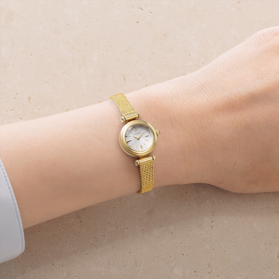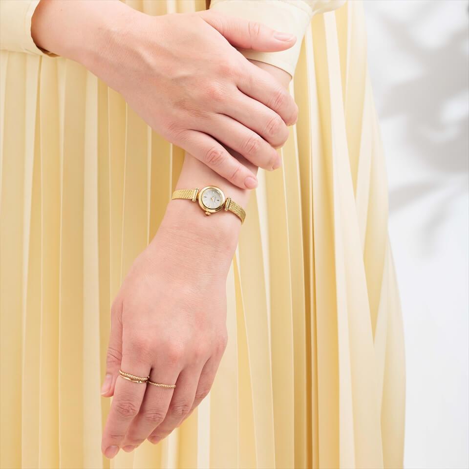 ころんとした形に、華奢な佇まいが魅力のラウンドケース。飾りピンに見立てたパーツやメッシュバンドが、シックでアンティークなジュエリーのような表情を演出。ガラス製のアクセサリーボックスをイメージしたカットガラスが繊細に輝きます。りゅうずにはケースに合わせたアクセントカラーをプラスし、さりげないおしゃれを楽しめます。