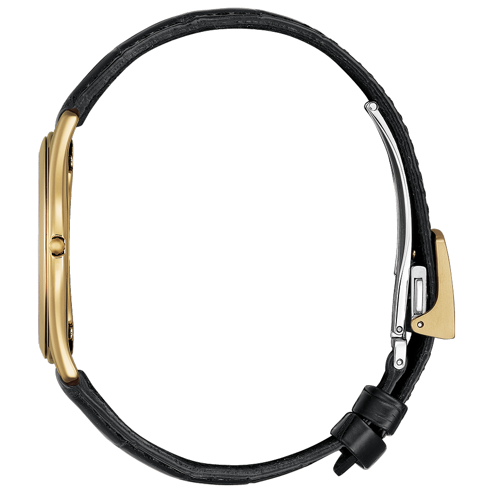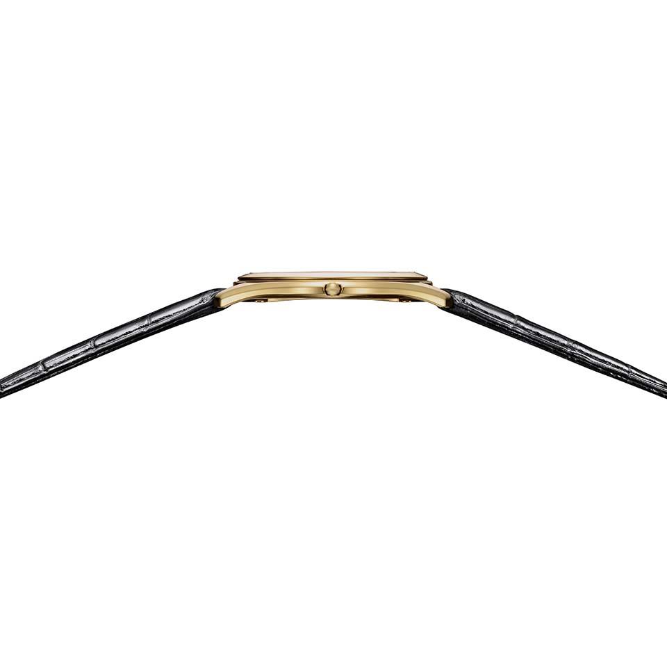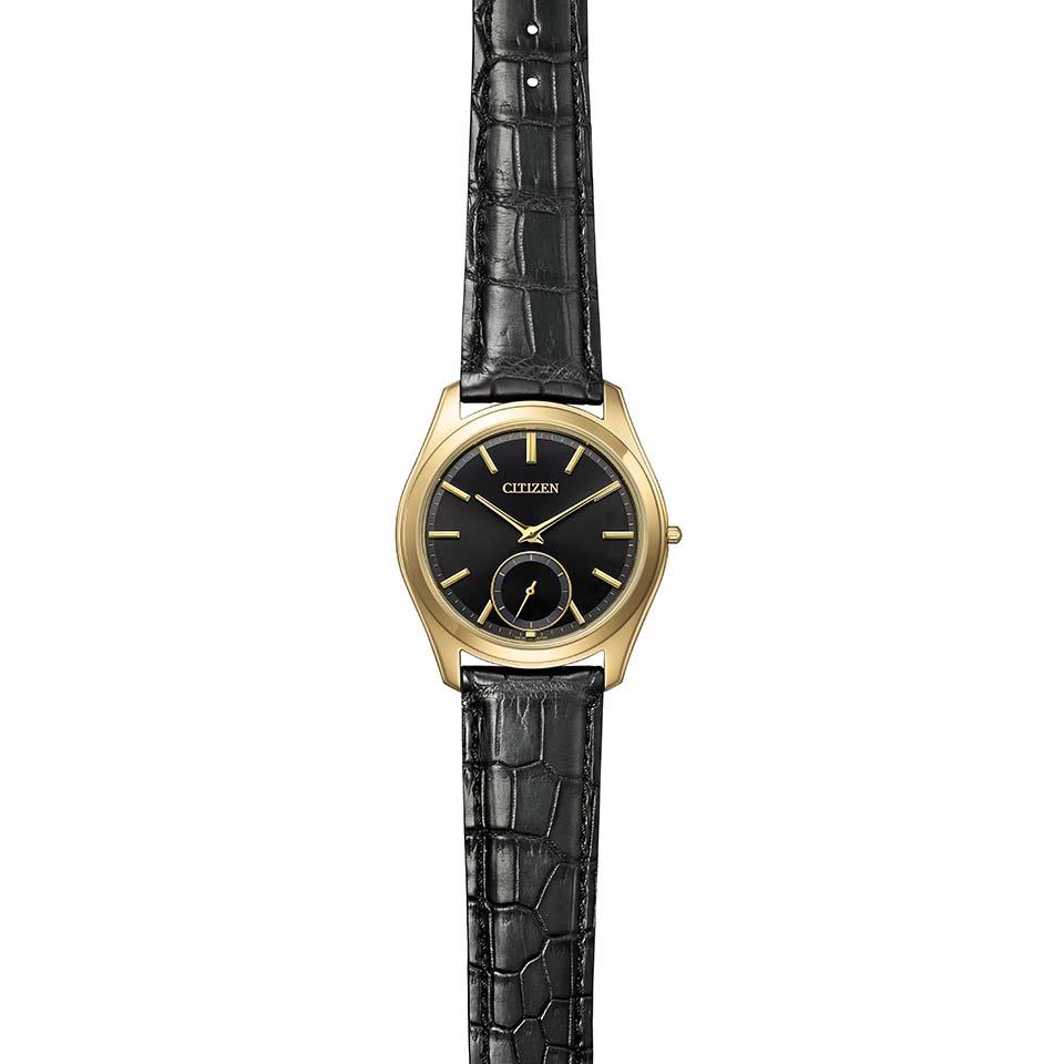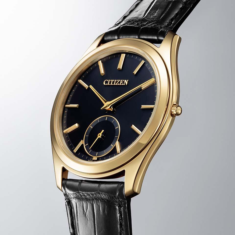 シチズン独自の表面硬化技術デュラテクトの新色、落ち着いたイエローゴールド色「アンバーイエロー」のケースに艶やかなブラックの文字板。無駄を削ぎ落した薄型フォルムとの調和を追求し、6時位置に配したスモールセコンドはインデックスを短くするなど、ミニマルな要素でまとめています。
