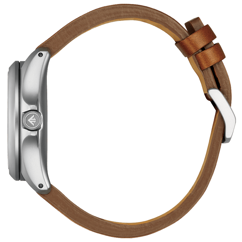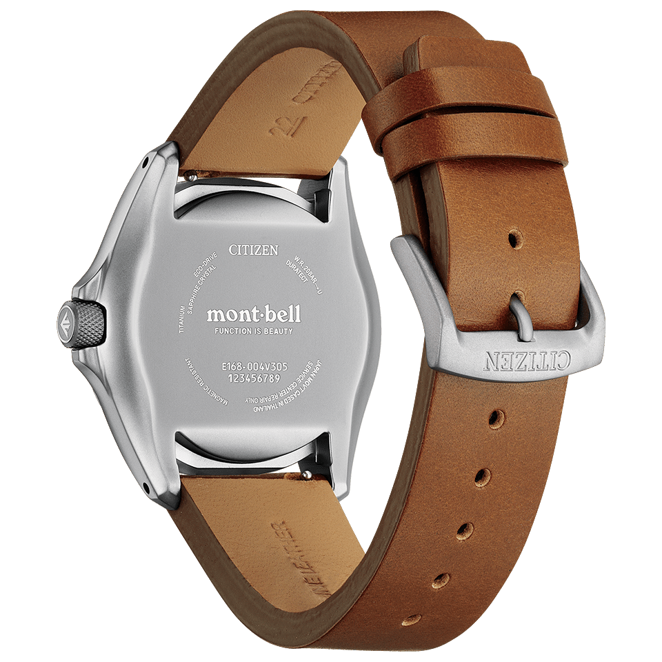 ダイバーズウオッチ用に開発されたCal.E168を搭載。アウトドアのハードな環境にも耐え抜くタフさ、昼夜問わない時刻の見やすさ、操作の簡単さといった、優れた実用性を備える1本です。ケースには打ちキズにも強いデュラテクトMRKを施しています。革バンドモデルは、シリコーンラバーバンド付属の2way仕様。ご自身でシーンに合わせて交換できるインターチェンジャブル構造です。裏ぶたレス構造のケースバックには、モンベルのブランドロゴをレーザー刻印。CITIZEN×mont-bellのロゴが入った専用ボックス付きです。