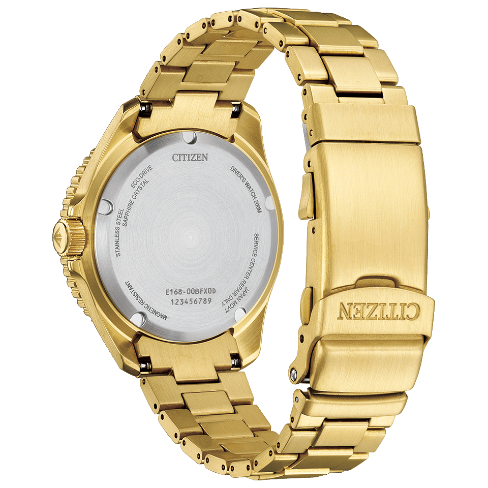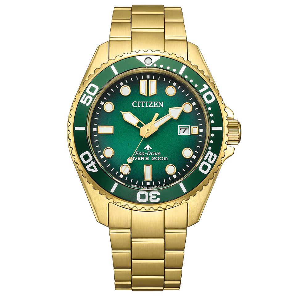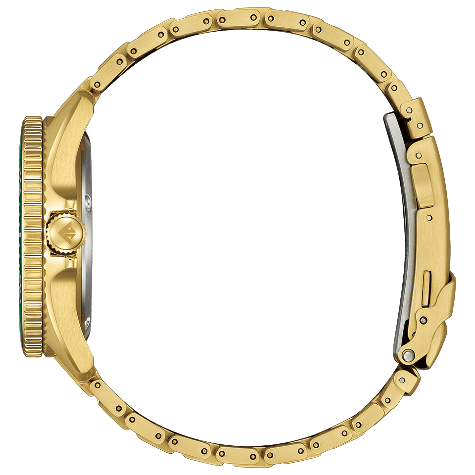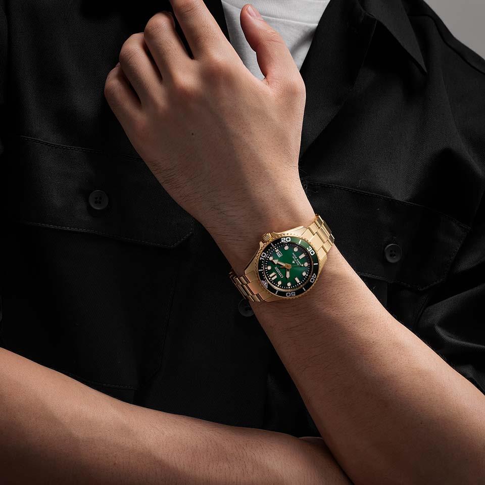 腕元になじみやすい40.6mmのケースを採用した正統派デザインのダイバーズウオッチ。回転ベゼルは、外周全体にやや深めの溝を刻んだオーソドックスな仕上がりで、優れた操作性も実現しています。3連メタルバンドは、別体構造の中駒を用い、斜面をミラー仕上げにした立体感のある力強いデザイン。バックルは、ダイビングスーツを着用した際なども簡単に調整・装着できるラチェット付ダブルホールディングバックルを採用しています。中心から外側にかけてグラデーションを施した文字板は、深く澄んだ海中を表現。シンプルながらも高級感のあるフェイスに仕上げています。