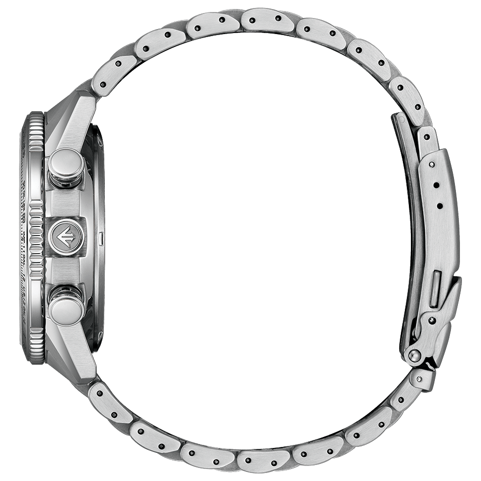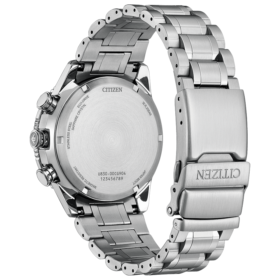 SKYシリーズのベストセラー、Cal.U680モデルと同様、文字板12時の位置にコックピットをイメージした3つのサブダイヤルを配置。アナログ×デジタルのハイブリッド。高精細なMIP液晶を6時の位置に配置し、読み違いのない時刻表示、多言語対応の日付表示、ストップウオッチ、曜日別セット可能なアラームなどの豊富な機能をエコ・ドライブの力で実現しています。単位変換や為替の計算などに幅広く使える航空計算尺ベゼルに加え、航空分野をはじめ国際的なシステムで利用されるUTC(協定世界時)を常時表示するなど、SKYシリーズ用にカスタマイズしています。充実したムーブメントの機能と合わせ、さまざまなシーンでユーザーを支えます。ケース形状やバンドは、SKYシリーズの特徴である航空機体のイメージを踏襲しています。光沢感を生かし、やや細めに仕上げたインデックスやベゼルが知的な印象を演出。精緻さと力強さを兼ね備えた独自の魅力を持つモデルが、新しいアナログ時計の可能性を切り拓きます。
