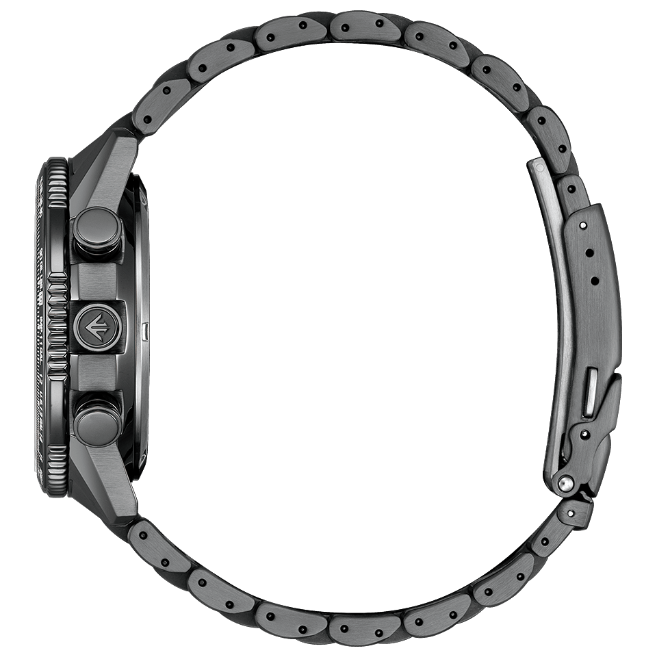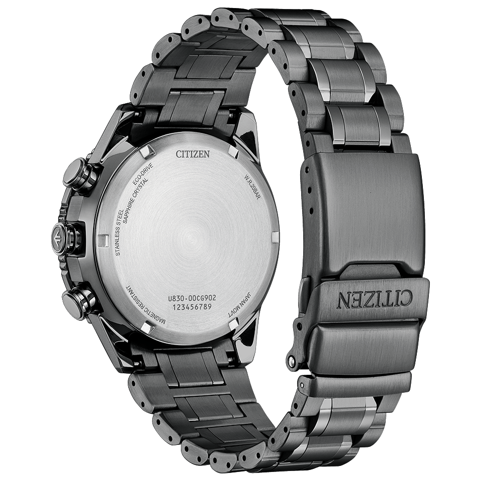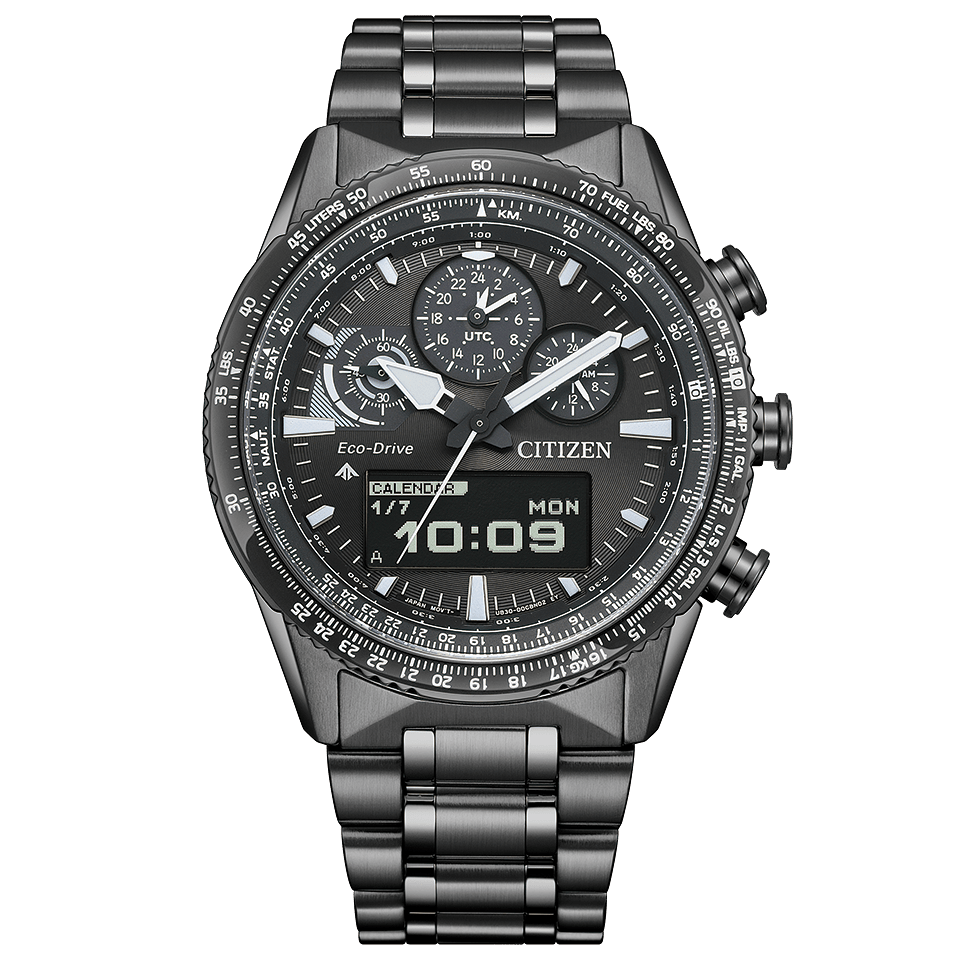 SKYシリーズのベストセラー、Cal.U680モデルと同様、文字板12時の位置にコックピットをイメージした3つのサブダイヤルを配置。アナログ×デジタルのハイブリッド。高精細なMIP液晶を6時の位置に配置し、読み違いのない時刻表示、多言語対応の日付表示、ストップウオッチ、曜日別セット可能なアラームなどの豊富な機能をエコ・ドライブの力で実現しています。単位変換や為替の計算などに幅広く使える航空計算尺ベゼルに加え、航空分野をはじめ国際的なシステムで利用されるUTC(協定世界時)を常時表示するなど、SKYシリーズ用にカスタマイズしています。充実したムーブメントの機能と合わせ、さまざまなシーンでユーザーを支えます。ケース形状やバンドは、SKYシリーズの特徴である航空機体のイメージを踏襲しています。光沢感を生かし、やや細めに仕上げたインデックスやベゼルが知的な印象を演出。精緻さと力強さを兼ね備えた独自の魅力を持つモデルが、新しいアナログ時計の可能性を切り拓きます。