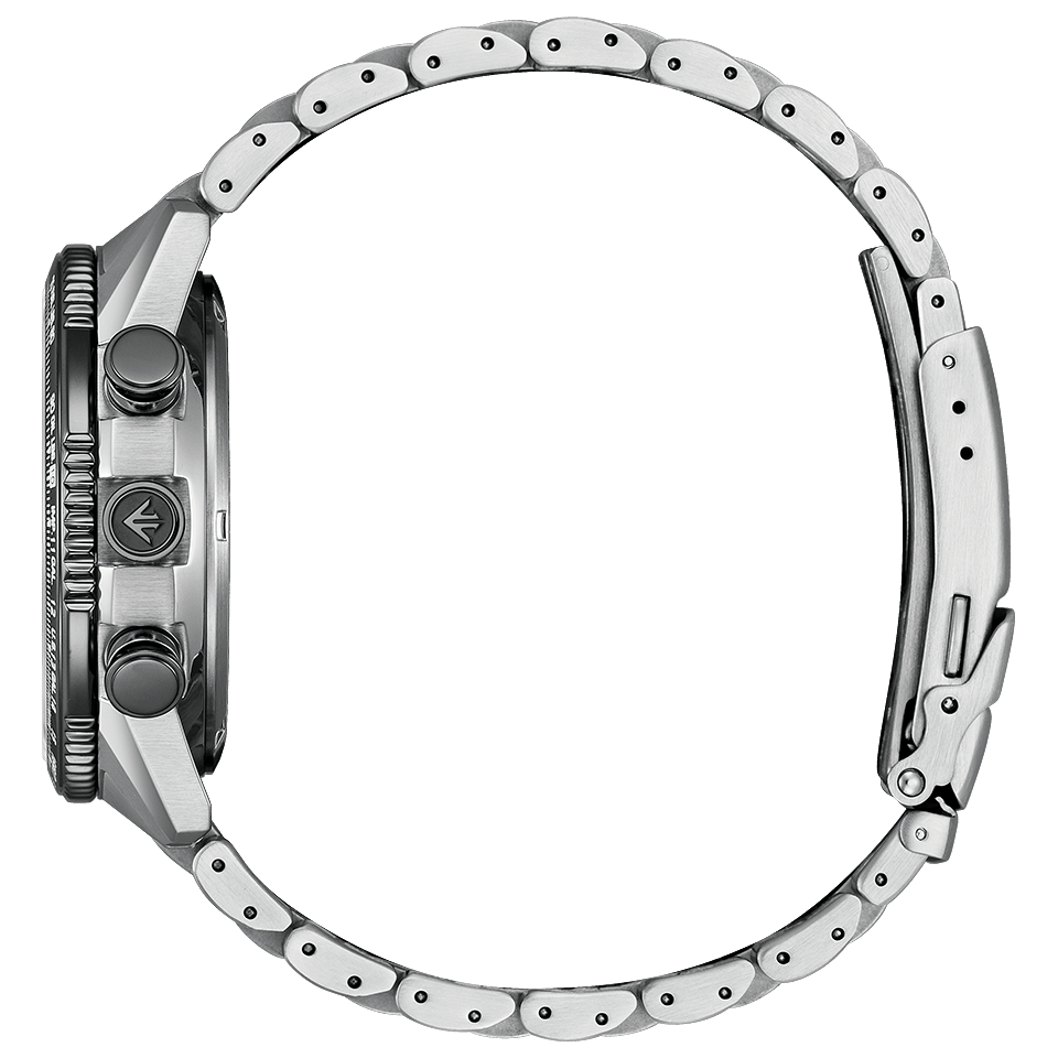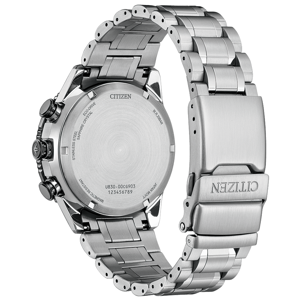SKYシリーズのベストセラー、Cal.U680モデルと同様、文字板12時の位置にコックピットをイメージした3つのサブダイヤルを配置。アナログ×デジタルのハイブリッド。高精細なMIP液晶を6時の位置に配置し、読み違いのない時刻表示、多言語対応の日付表示、ストップウオッチ、曜日別セット可能なアラームなどの豊富な機能をエコ・ドライブの力で実現しています。単位変換や為替の計算などに幅広く使える航空計算尺ベゼルに加え、航空分野をはじめ国際的なシステムで利用されるUTC(協定世界時)を常時表示するなど、SKYシリーズ用にカスタマイズしています。充実したムーブメントの機能と合わせ、さまざまなシーンでユーザーを支えます。ケース形状やバンドは、SKYシリーズの特徴である航空機体のイメージを踏襲しています。光沢感を生かし、やや細めに仕上げたインデックスやベゼルが知的な印象を演出。精緻さと力強さを兼ね備えた独自の魅力を持つモデルが、新しいアナログ時計の可能性を切り拓きます。