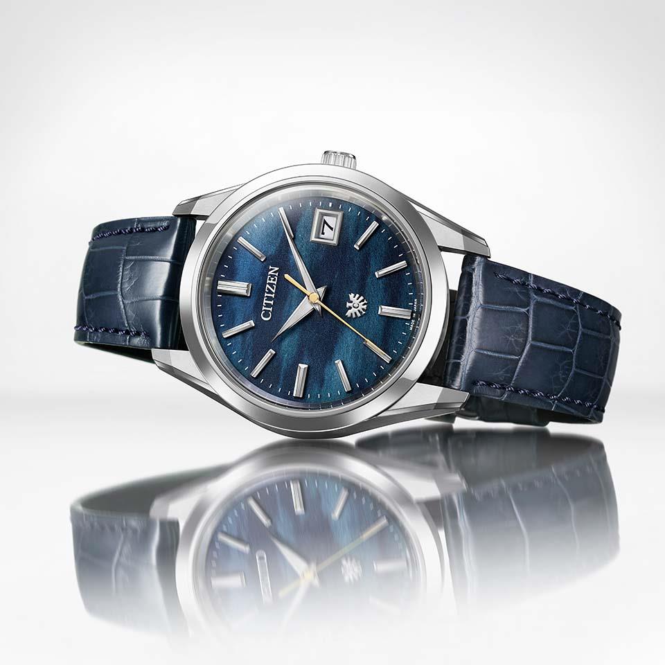 ジャパンブルーが印象的な藍染和紙を文字板に用いたモデルは、「夏の夜の情景」を表現しています。静謐な川をモチーフに月明かりで揺れる穏やかな川の流れを描き、川のほとりに飛び交う蛍の軌跡を描くべく、秒針はゴールドカラーを採用しました。