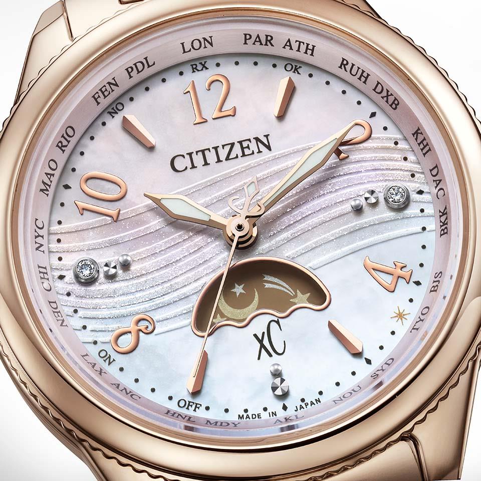 淡く上品なサクラピンク®のケースと、白蝶貝の文字板にブルーグレーからピンクに変化するグラデーションを施した幻想的なカラーリング。エッチングとラメで描いたパターンが、波打ち際のキラキラとした輝きを連想させ、桃色に染まる夕暮れ時の海辺を表現しました。