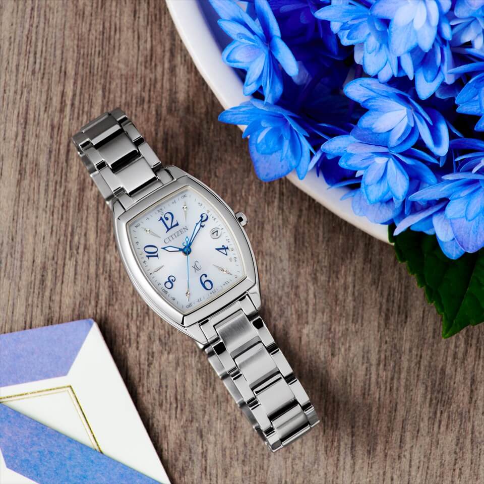 エターナルプラチナのシルバーカラーに、ブルーの針とブルーのアラビア数字のインデックスがアクセントに。
