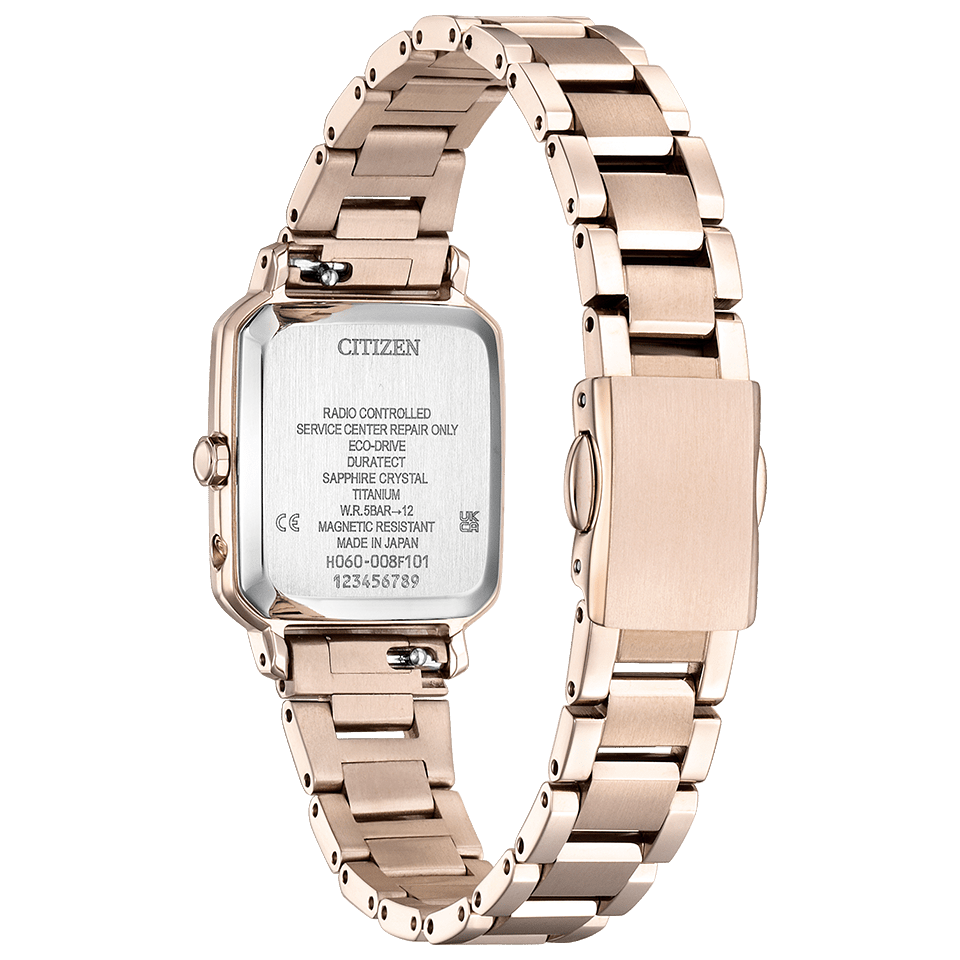 やさしくフェミニンな印象を与える、サクラピンク®のスクエアケースに、クラシカルで華やかな白蝶貝文字板を組み合わせたモデル。