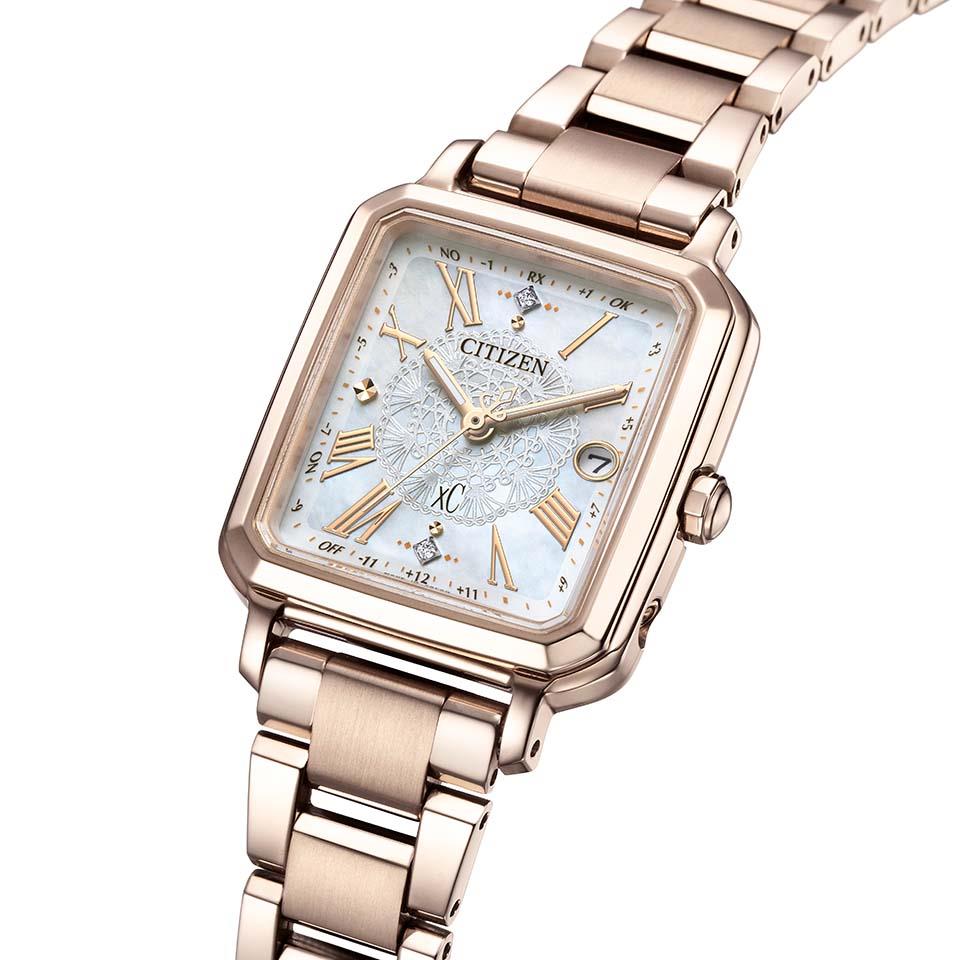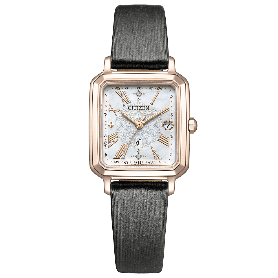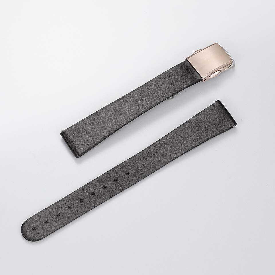 文字板にはほんのりとベージュカラーを重ね、中央には繊細なアンティークレースをモチーフにしたパターンをエッチングで描いています。12時と6時位置にはラボグロウン・ダイヤモンドをセッティング。ネックレスのような装飾が、さりげないアクセントとして輝きを添えます。ダークグレーのサテン調バンドをセットした2Way仕様で、気分やシーンに合わせて簡単にバンド交換ができるインターチェンジャブル構造を採用しています。