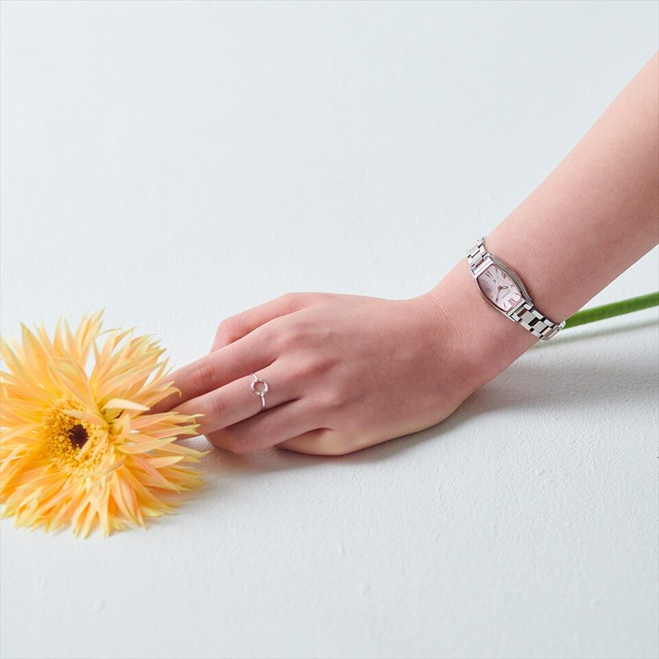 華奢でエレガントな長角ケースのエコ・ドライブモデル。ケースサイドのフローラインがしなやかな女性らしさを表現しています。文字板のインデックスには柔らかい印象のローマ数字を採用。時分秒針の3針なので、時間も見やすく実用的なモデルです。バンドは長さ調整が手軽なシンプルアジャストバンド。