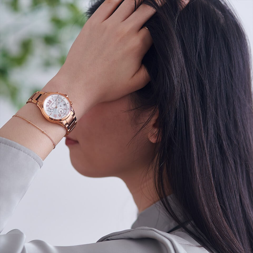 女性の腕元を知的に飾るクロノグラフ搭載のエコ・ドライブモデル。ケース径32mmのミディアムサイズで、いつものコーディネートを上品に知的に演出します。文字板にはさりげなくチェックパターンを施し女性らしさも表現しています。