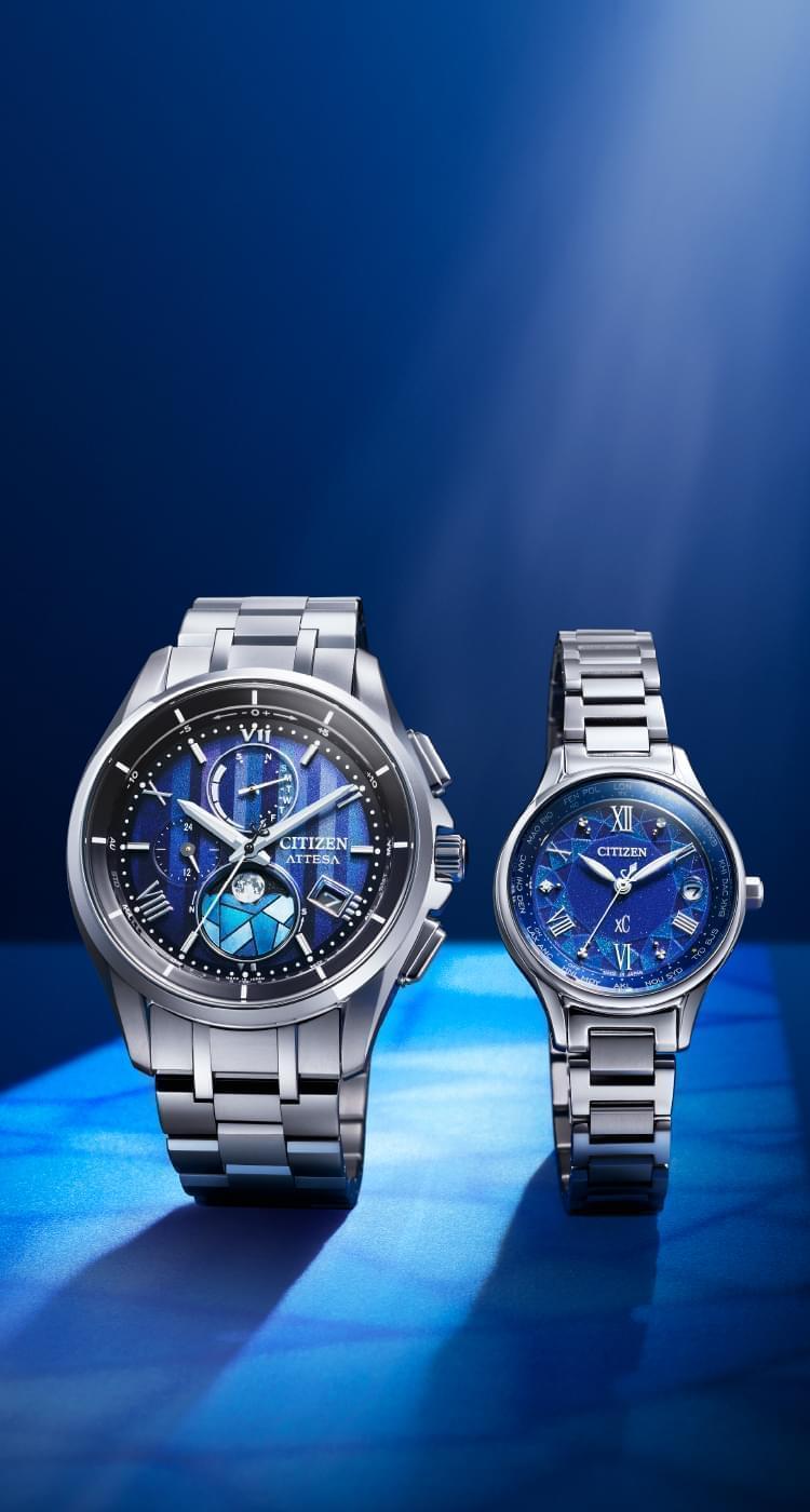 澄み切った冬の空気を表現したブルーの文字板に、ステンドグラスをイメージしたパターンで、光によってキラキラと輝く様子を表現しました。