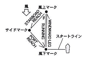 通常のヨットレースでは下図のようなマークが設定され、決められた順番にマークをいかに早く周るかで順位を競います。方位は北=0°、東=90°、南=180°、西=270°というように角度で表されます。またヨットが中心軸より右から風を受けて走る状態をスターボードと呼び、逆にヨットが中心軸より左から風を受けて走る状態をポートと呼びます。