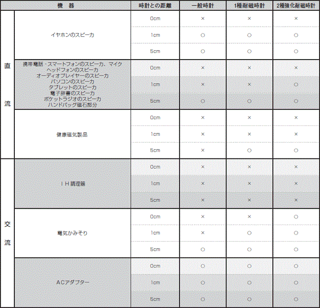 時計を機器に近づけも大丈夫な距離を○、止まりなどの影響が出てしまう距離を×で表しています。